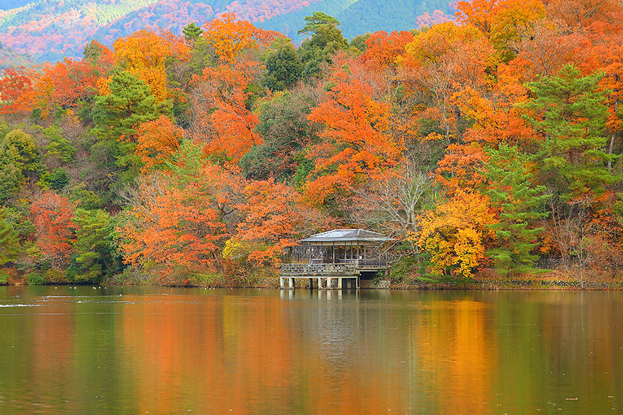 宝が池公園に紅葉シーズンが訪れると、池周辺の木々が色づき訪れる人々を楽しませる。公園の一部分には背の高い針葉樹であるメタセコイアもある。カエデ科のモミジは野鳥の森あたりに多い。池の周囲を散策していると紅葉越しに比叡山がよく見える。 |
