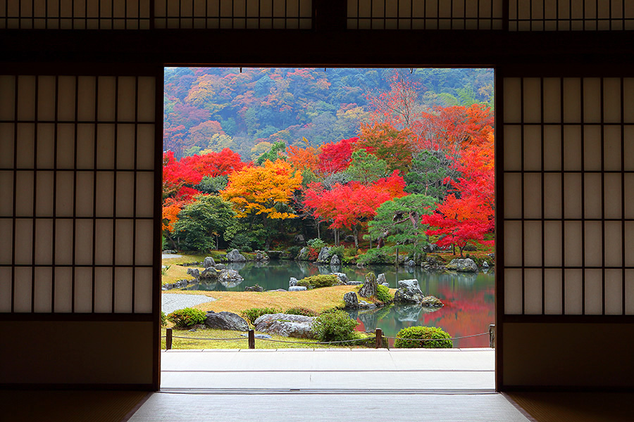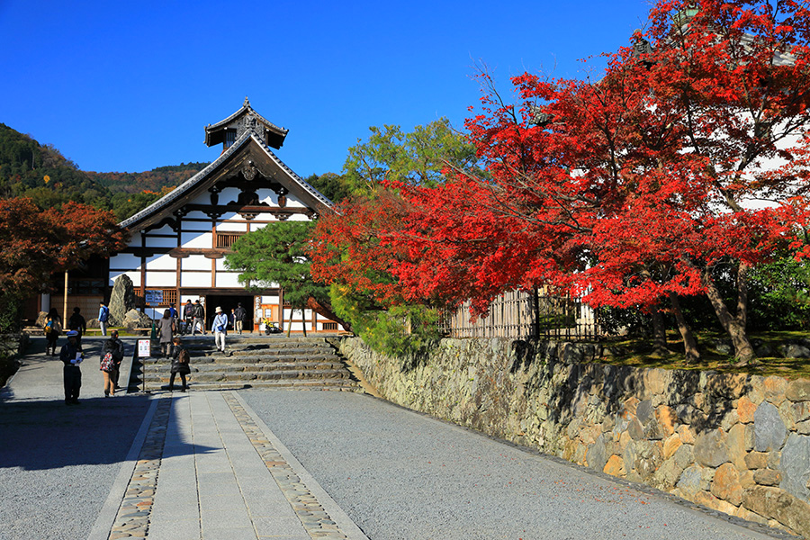 天龍寺の紅葉の見ごろは例年11月中旬〜下旬。境内はとても広いので、ゆっくり見てまわると1時間ほどかかるだろう。 |
