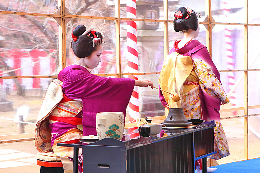 一般の人でも上七軒の芸舞妓のお手前でいだだける野点大茶湯は午前10時〜午後3時の間に境内に設置された大きなテントにて催される。これは豊臣秀吉公ゆかりの「北野大茶湯」にちなんだ野点(のだて)。野点とは、屋外の庭園や川辺などでお茶(抹茶)を点てて楽しむ茶会のこと。作法などを気にすることなく、誰でも気軽に芸舞妓のたてたお抹茶をいただける。とても人気の行事で多くの参拝客が訪れる。 |