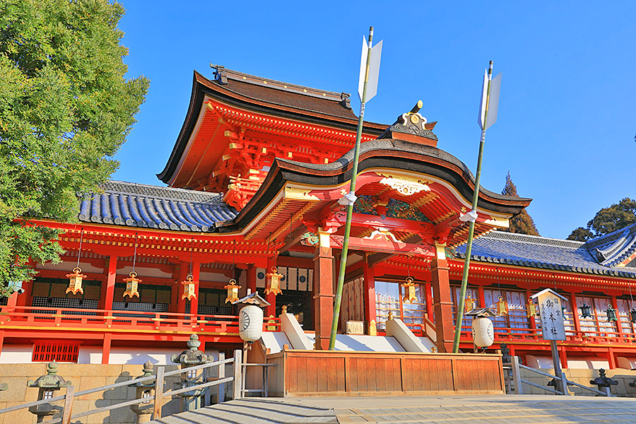 (おきながたらしひめのみこと)。日本三大八幡宮のひとつに数えられる格式の高い神社。本殿などが国宝に指定されている。京都や大阪の人々から「やわたのはちまんさん」と呼ばれ親しまれ、初詣には多くの参拝客が訪れている。 |