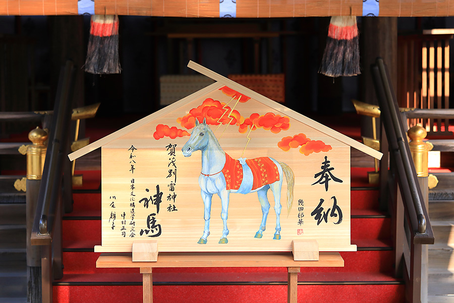 上賀茂神社では正月飾りとして中門上に宝船(たからぶね)が飾られる。ミチクサで編まれた船に、五本の幸運の当たり矢をさしてある。幸運を呼ぶ縁起物として例年 節分頃まで設置されている。その期間中に宝船の下をくぐると一年を健やかに過ごせると言われている。また細殿には大絵馬が飾られる。そして例年正月の5日までは神馬の神山号(こうやまごう)が出社している。 |