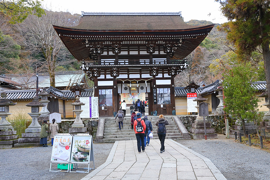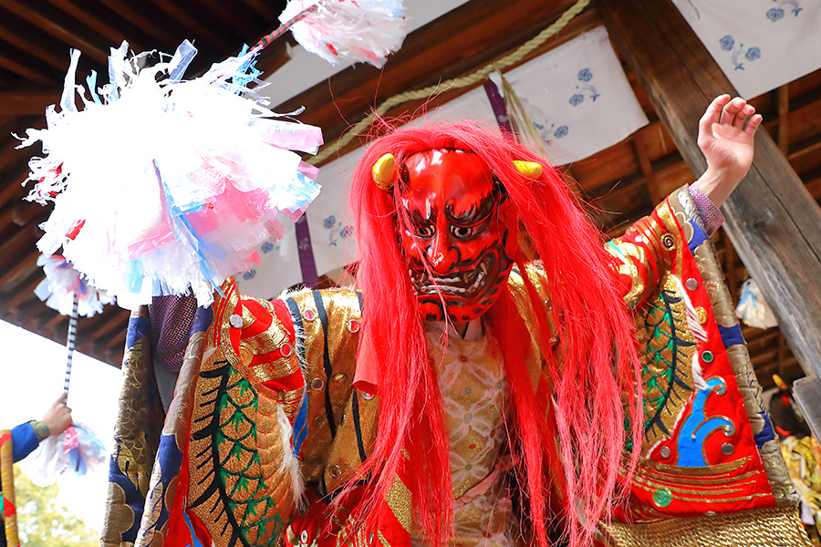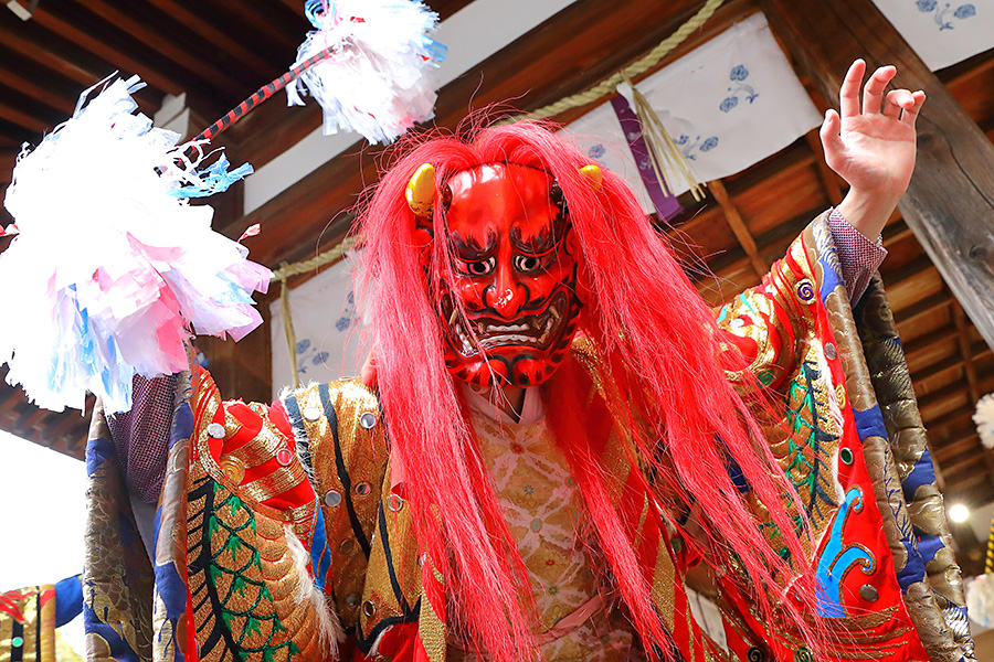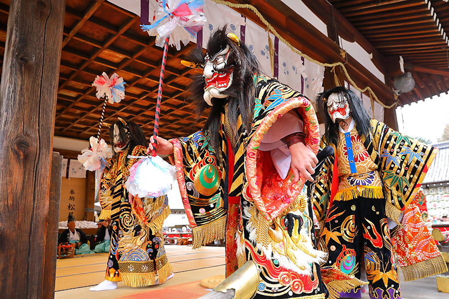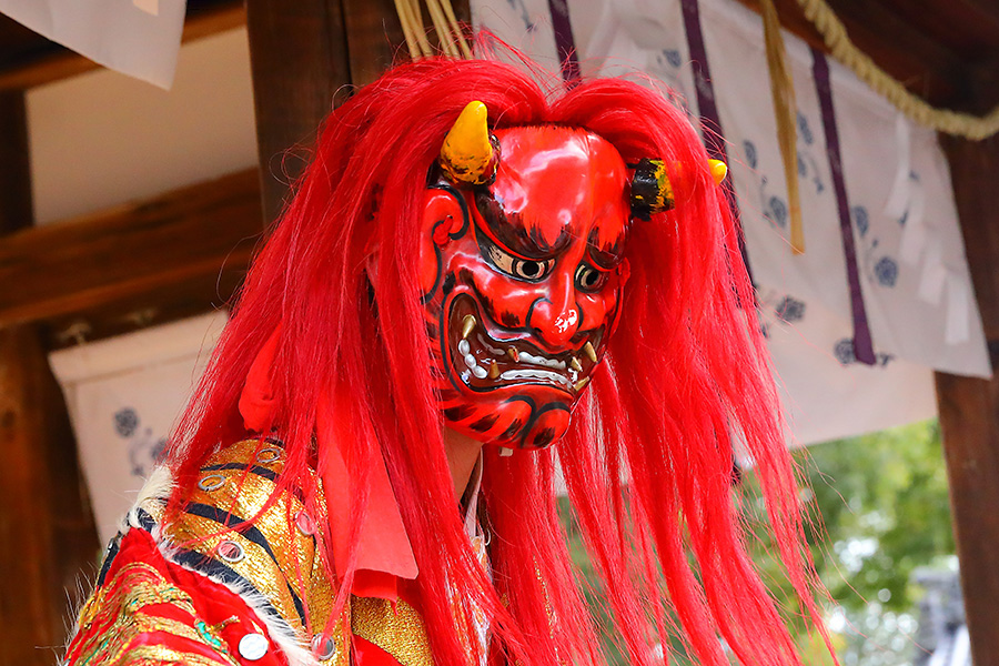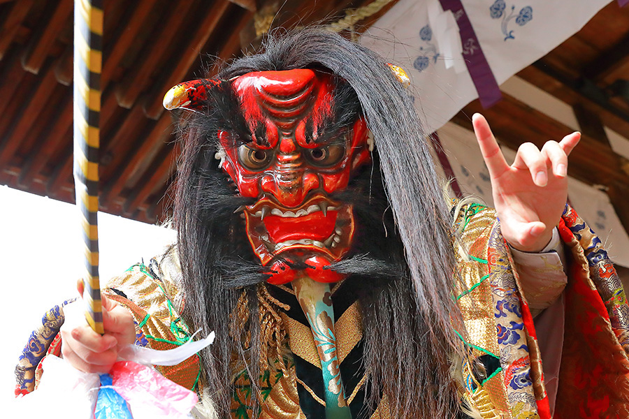 松尾大社の節分祭は、毎年2月3日に御本殿前や拝殿にて盛大に執り行われる。まず10時頃から拝殿にて「石見神楽」の奉納がある。そして13時半から御本殿にて神職さんたちによって節分祭の祭典が行われる。その同時刻に鬼たちが拝殿に登場し鬼の舞を披露する。この鬼さんたちは、凛々しい鬼面ときらびやかな衣装を身にまとい、とにかく カッコイイ。そして、参拝客に対してフレンドリーな対応がある。拝殿そばの人たちとハイタッチしたり、握手したり、けっこう盛り上がる。登場する鬼たちは、島根県益田市から招かれた石見神楽(いわみかぐら)の神楽団の皆さんが演じている。 |