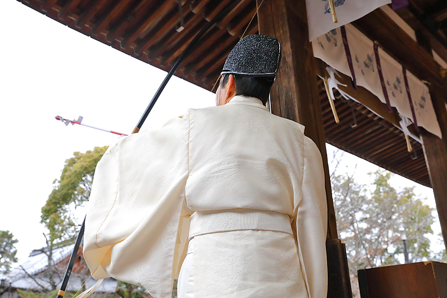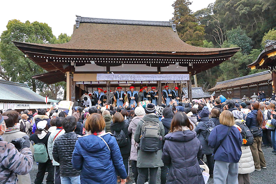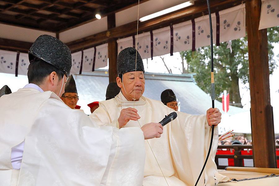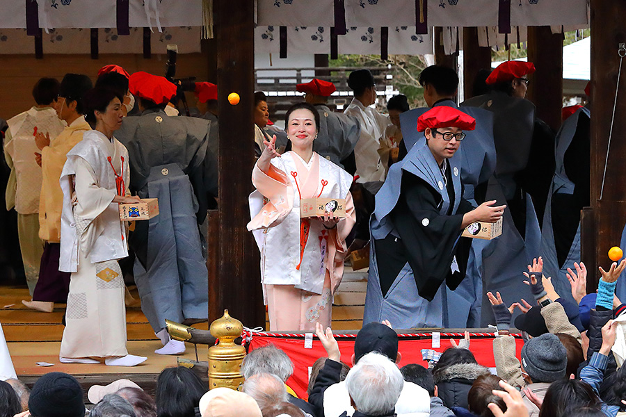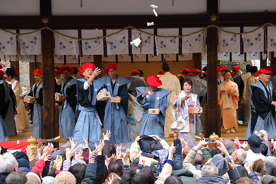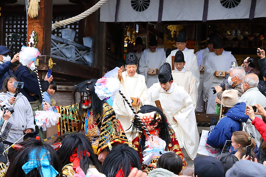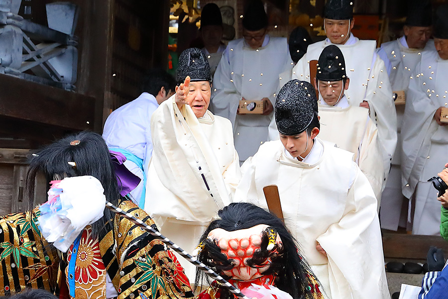 その後、14時くらいになると、鬼さんたちが御本殿前に行き、追儺行事が始まる。鬼たちは神職さんに豆を投げられると弱っていき、拝殿に逃げ込み、そのまま退散していく。神職さんたちは、そのままの流れで拝殿に上がり、宮司さんが弓を構え弦を3回引き和歌を唱え、疫鬼退散を祈願する「鳴弦引目神事」(めいげんひけめしんじ)を執り行う。つづいて鳴弦破魔弓神事、四方奉射神事を終えると、年男年女の皆さんが登場し福豆撒きが始まる。 |