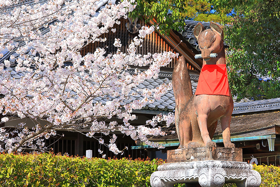 伏見稲荷大社に桜シーズンが訪れると参道沿いにある桜が華やかな雰囲気をつくり出し、春らしい景観を届てくれる。一の鳥居のそばに桜木が多い。二の鳥居の近くにも桜が咲いている。また千本鳥居へと続く順路の途中にある狛狐のそばにも桜の木がある。 |