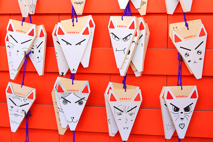 そして観光客に人気のある伏見稲荷大社の白狐絵馬(びゃっこえま)も注目ポイント。白狐の顔に自分だけの表情をつけたらお稲荷様の使いである白狐が願いを届けてくれます。また伏見稲荷大社らしい願掛け鳥居絵馬も人気。これをお土産として持ち帰る人も多い。この願掛け鳥居絵馬が並ぶ絵馬掛所は壮観。 |