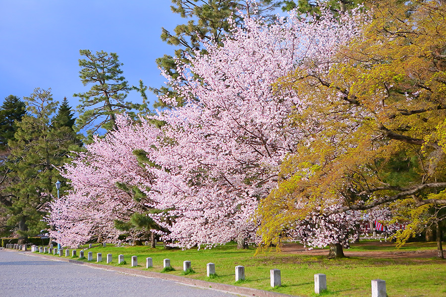 京都市上京区に位置する京都御苑(きょうとぎょえん)。様々な品種の桜が苑内各所に見られるので、京都桜シーズンの3週間ほどの期間を通して花見を楽しむことができる桜名所。 |