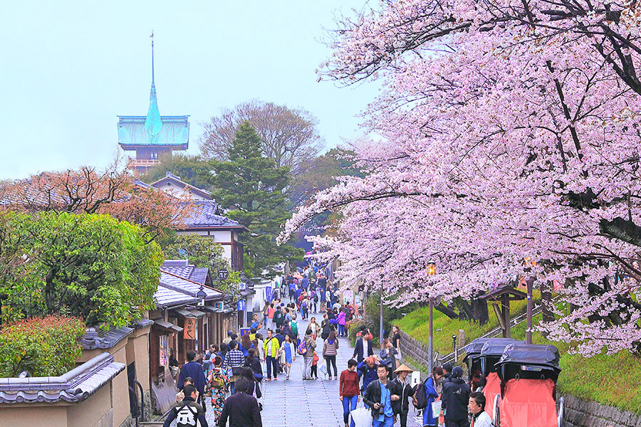 石塀小路、ねねの道、二年坂など京都風情の残る路地が続く東山エリア。その路地のあちらこちらに桜が見られる。東山の路地には、和物のお土産屋さん、カフェ、お食事処などが並び、京都の魅力を結集させて訪れた旅行者たちを楽しませている。東山界隈の中でも桜木が多く、花見のハイライトとなっているのは三年坂と高台寺公園。 |
