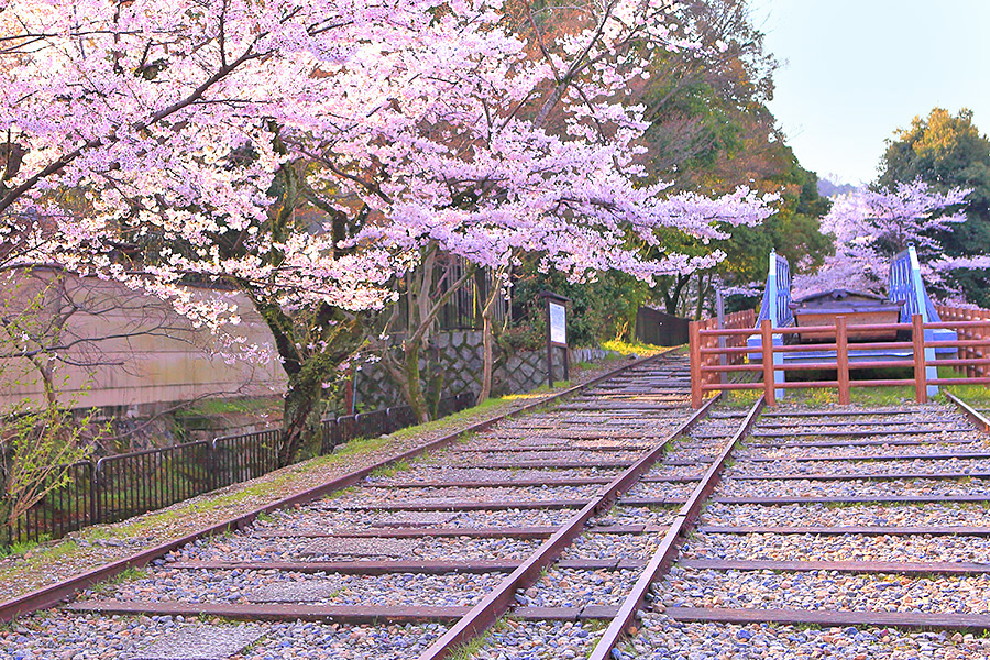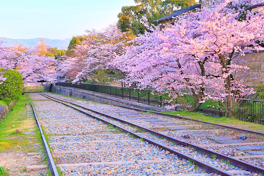 京都市左京区の蹴上(けあげ)にあるインクライン沿いには桜木が並び、春には華やかな景観をつくり出す。近年では非常に人気のある桜スポットとなり、多くの人が花見に訪れている。和装姿で記念撮影している人たちが多い。このインクラインの上側ではきれいに並んだ桜並木が見られる。また下側に歩いていくと船溜に近い位置にはさらに大きな桜木がある。 |