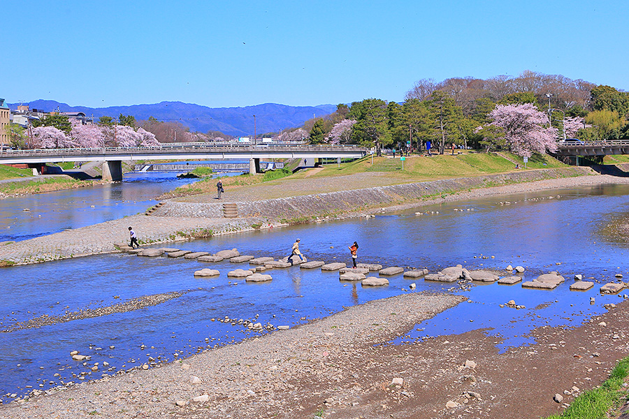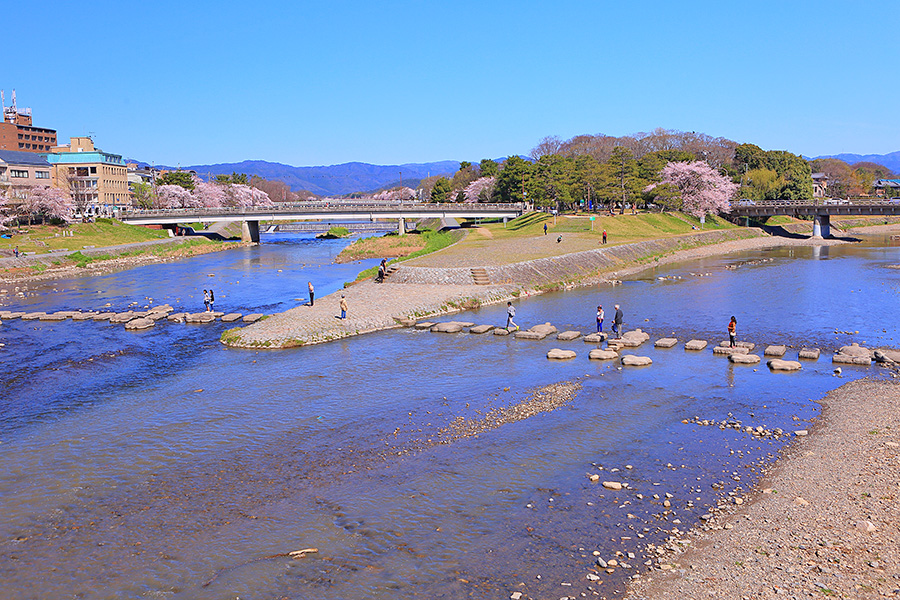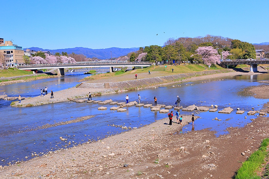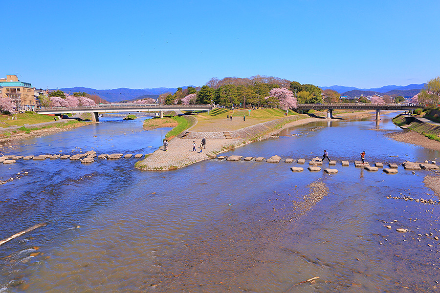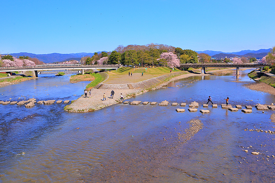 また鴨川と賀茂川と高野川が合流する三角州は鴨川デルタと呼ばれており、京都の人気スポットとなっている。飛び石で川を渡るのがひとつのアトラクションとして楽しまれている。この鴨川デルタ辺りでも花見を楽しんでいる人たちを見かける。 |