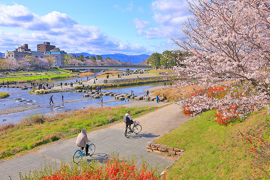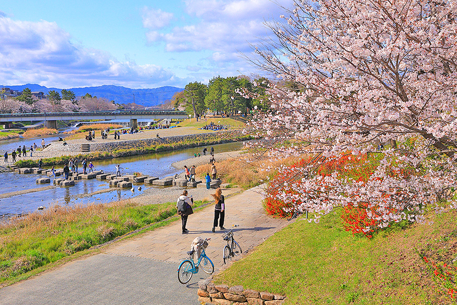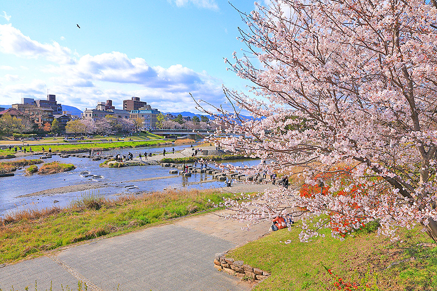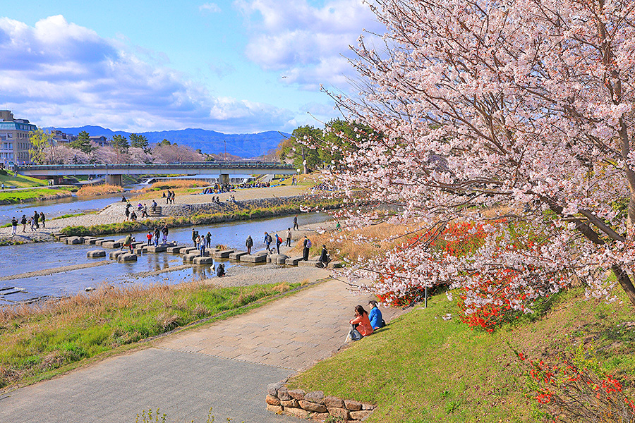 桜シーズンには、鴨川沿いに座って花見を楽しむ観光客が多い。この辺りにはコンビニや軽食セットを販売しているお店もあり、水辺の桜を眺めながらの食事は春ならではの楽しみ。 |