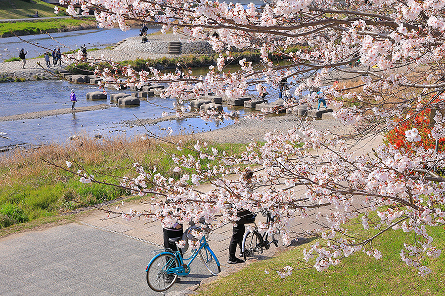 京都市を北から南へ流れる鴨川(かもがわ)。その川沿いには多くの桜木が並んでいる。その中でも見どころとなっているのは、四条大橋から三条大橋までの区間。京都の風情あふれる場所で、水辺の桜に出会える。夏には鴨川納涼床が開催される。 |