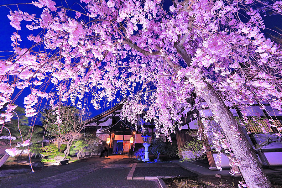 近年では枯山水庭園である四海唱導の庭(龍華飛翔の庭)が特別拝観として公開され、庭の枝垂れ桜と和傘とのコラボレーションが楽しめるようになっている。また夜間特別拝観の桜ライトアップも行われており、昼とはちがった艶のある庭園風景にも出会える。 |
