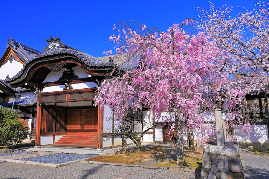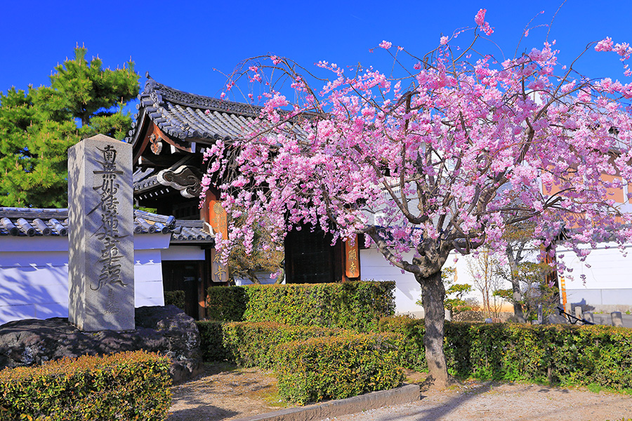 お寺は各地を転々としたが天正12年豊臣秀吉の命により、現在地に移ってきた。ここに桜シーズンが訪れると、本堂周辺に染井吉野桜や枝垂れ桜が咲き乱れる。 特に本堂の裏手にある庫裏・方丈の近くに咲く枝垂れ桜が美しい。 |