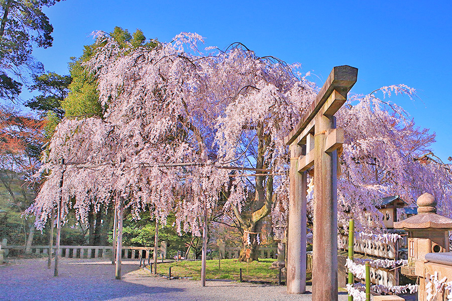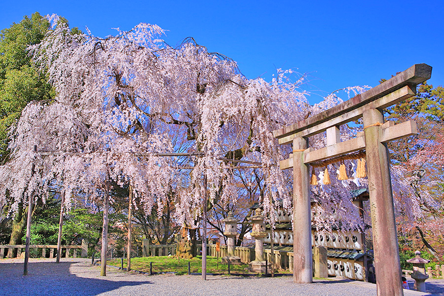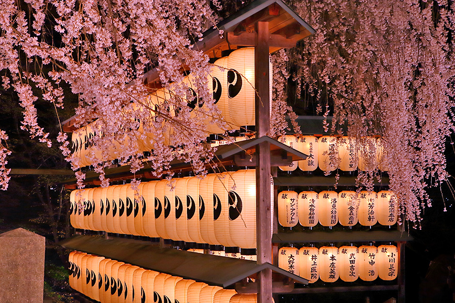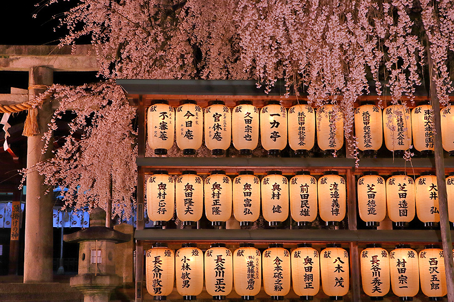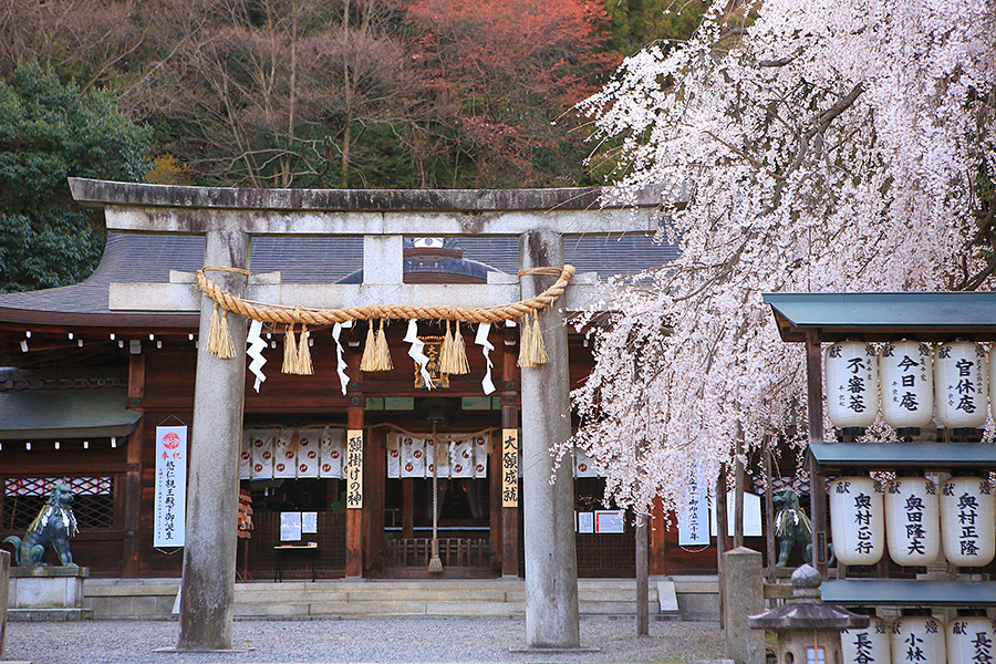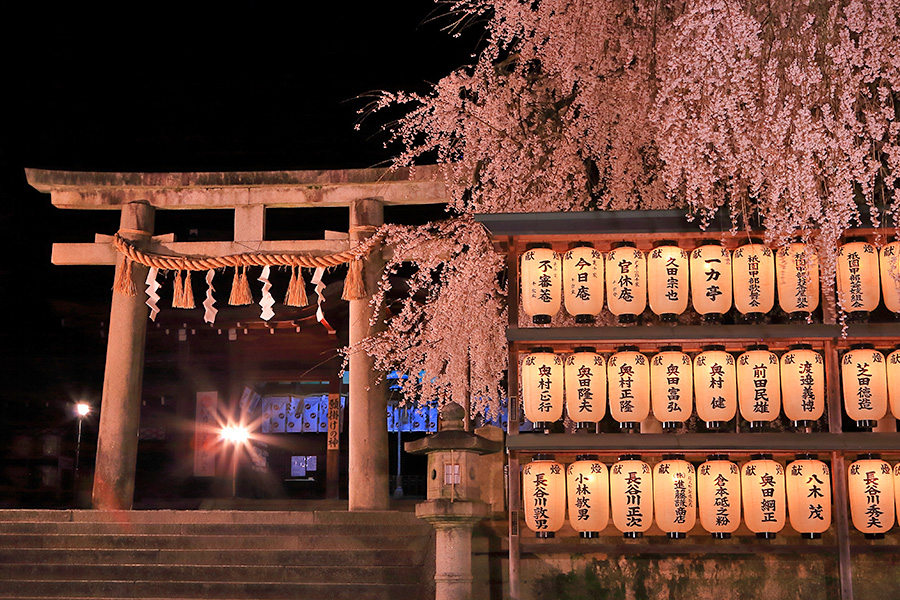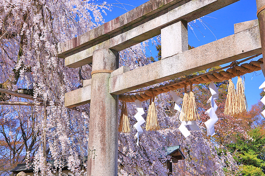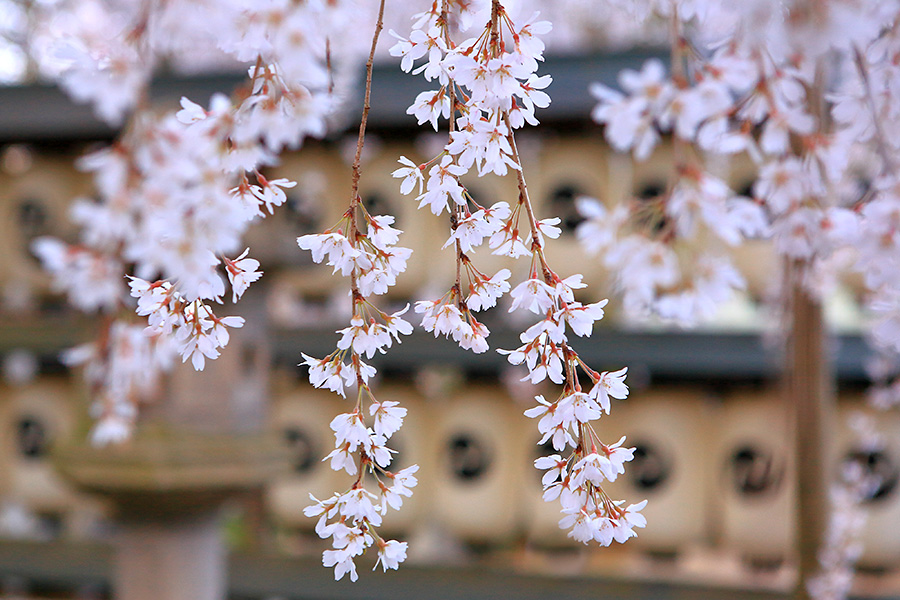 静かな佇まいの境内には大石桜(おおいしざくら)という枝垂れ桜が美しく咲く。提灯に覆いかぶさるように咲く花がとても絵になる桜スポット。また参道沿いにも桜木が見られる。 |