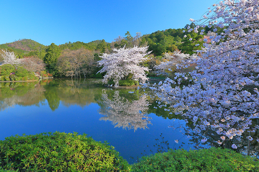 京都市右京区にある龍安寺(りょうあんじ)。その境内は世界文化遺産として登録されている。春には世界的に知られている石庭(せきてい)を紅しだれ桜が優雅に彩る。また鏡容池の周辺にも桜が咲き乱れ、華やかな景観を見せてくれる。 |