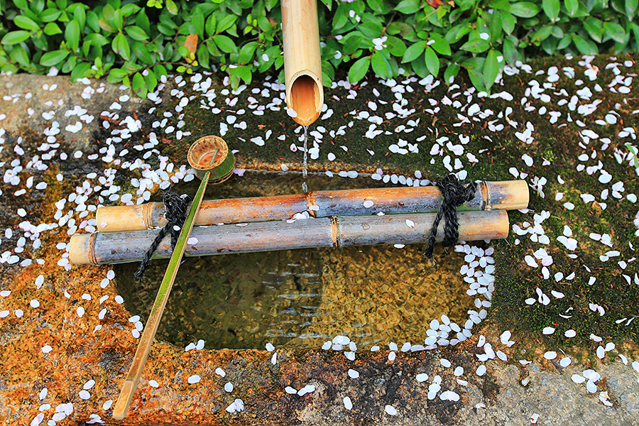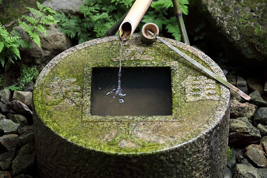 龍安寺のつくばい(手水鉢)に刻まれている「吾唯足知」(われただたるをしる)。中央の四角穴を「口」の字に見立て、周囲の4文字と組み合わせて、時計回りに読みます。これは仏教の「知足」(ちそく)の精神を表している言葉で、「いま持っているだけで満足することを知っている」という欲望に惑わされない心の豊かさを持とうという教え。この龍安寺つくばいは、方丈北側(石庭の裏手)にある。 |