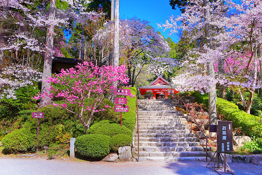 三千院に春が訪れると金色不動堂のそばに桜と梅が同時期に咲くというめずらしい光景が見られる。春らしいビビットなピンクがまぶしく、なんとも印象的な花見に浸れるだろう。 |