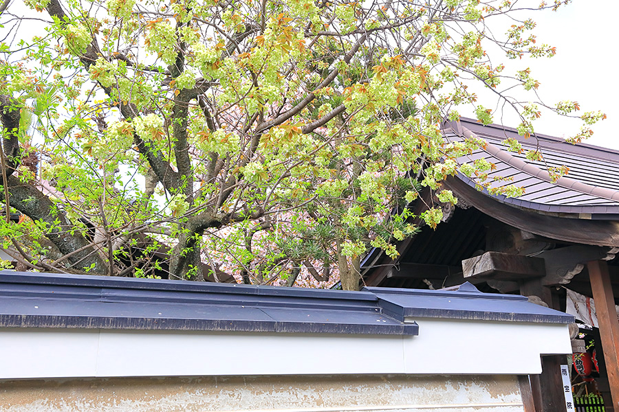 雨宝院の見どころは本殿前にある歓喜桜という名の八重桜。ここの住職さんが「ここの桜は仁和寺の御室桜と同じ種類ですよ。」と話ていた。また御衣黄(ぎょいこう)と呼ばれる緑色の桜も花を咲かせる。 |