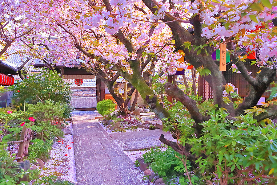 雨宝院の桜の見頃は京都市内でも遅めの4月中旬〜下旬にかけて。境内をさくら色に染める散り桜も美しいお寺。 |