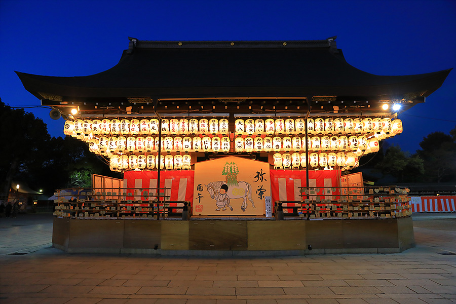 また八坂神社では年間を通して様々な行事が執り行われる。一般的に広く知られているのは、お正月の1月3日かるた始め式、1月9、10日の蛭子社祭、そして2月の節分行事である花街の舞妓たちによる奉納舞踊や豆まきなど京都らしい華やかな行事が参拝者を楽しませている。 |