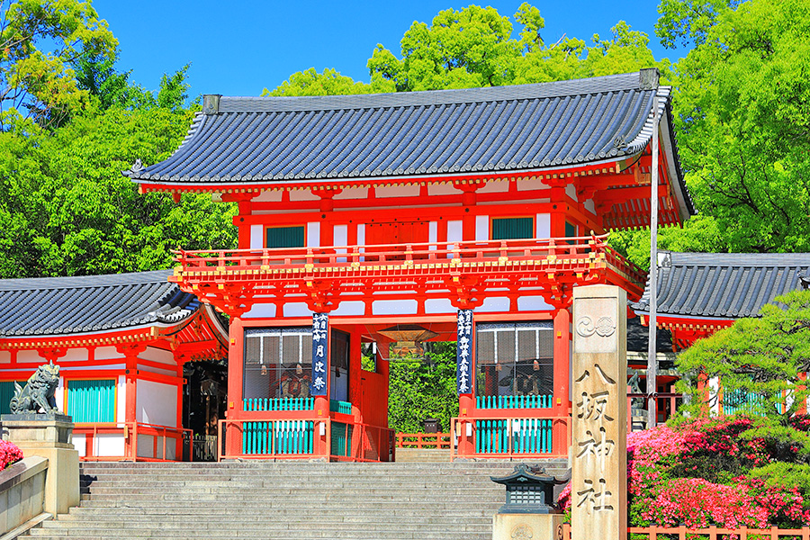 京都市東山区に位置する八坂神社(やさかじんじゃ)。地元の人たちからは「祇園さん」と呼ばれ親しまれている。八坂神社を表現する際によく西楼門の写真が使われるが、実は南楼門が正門。 |