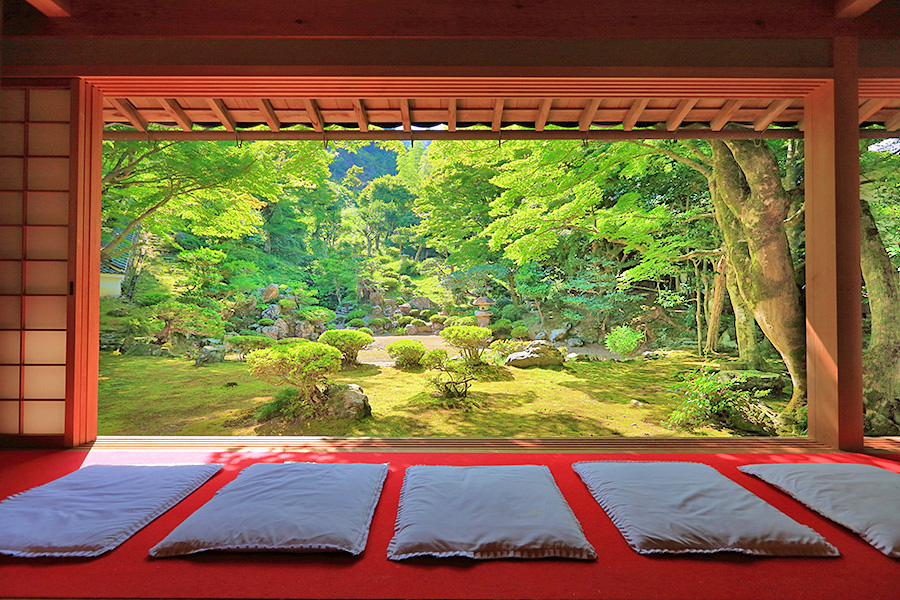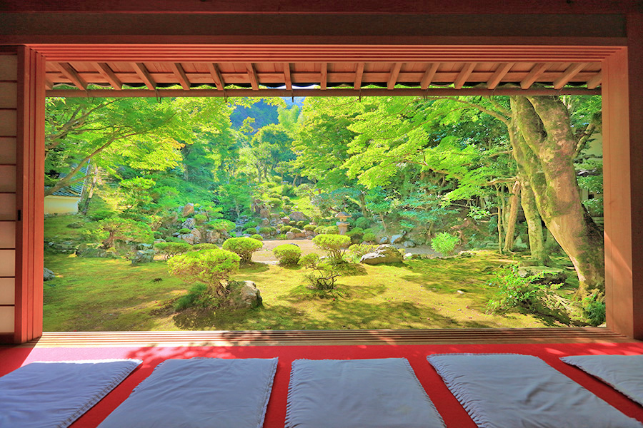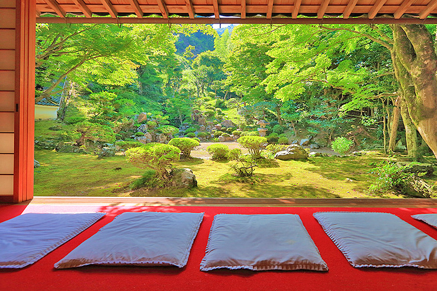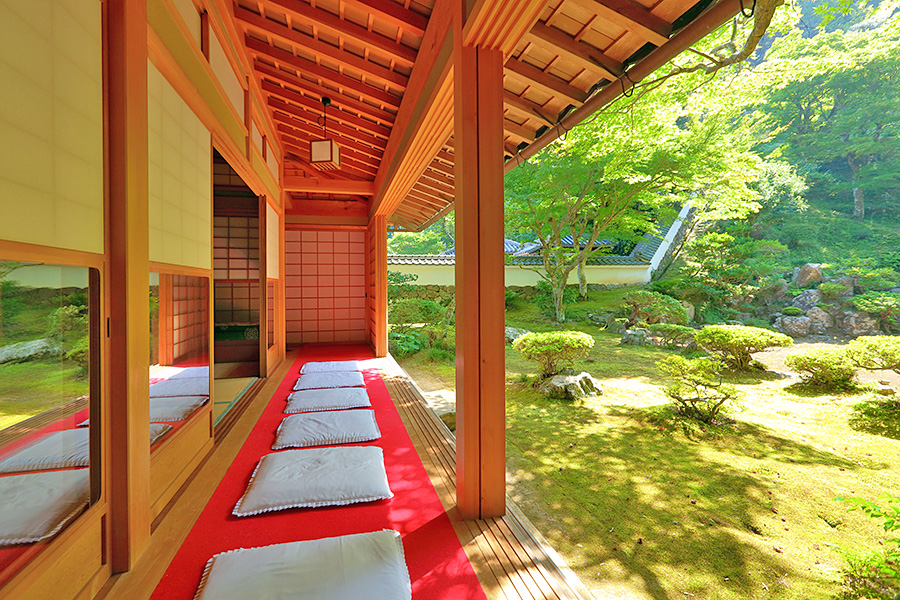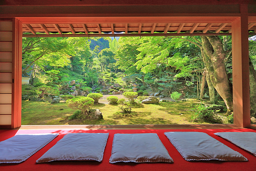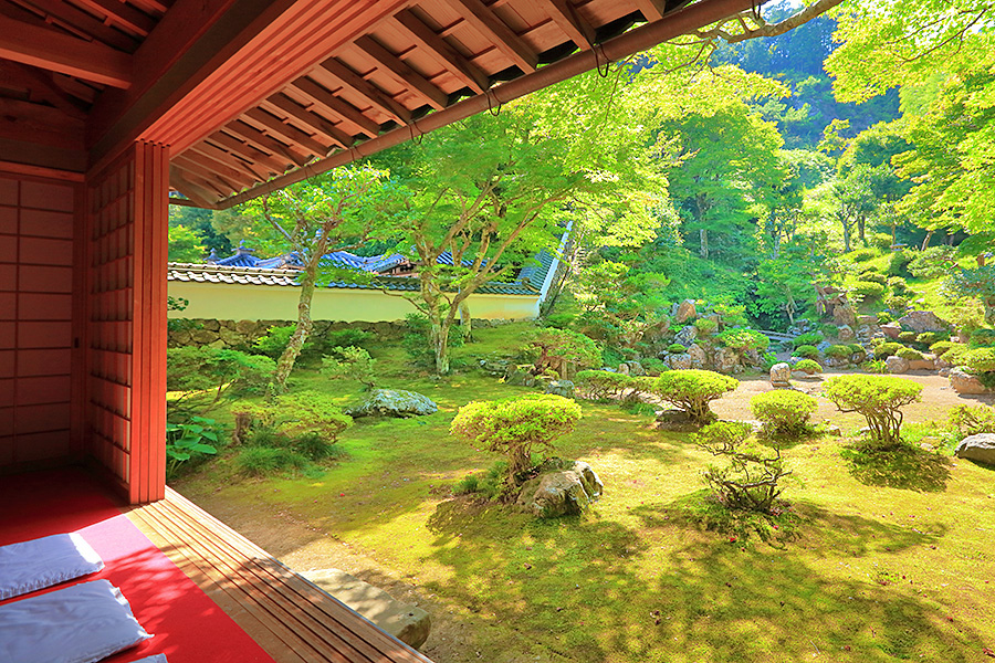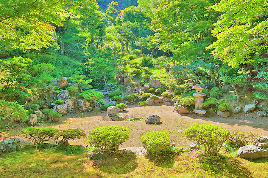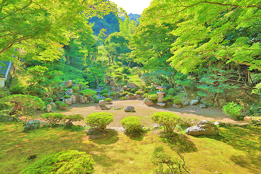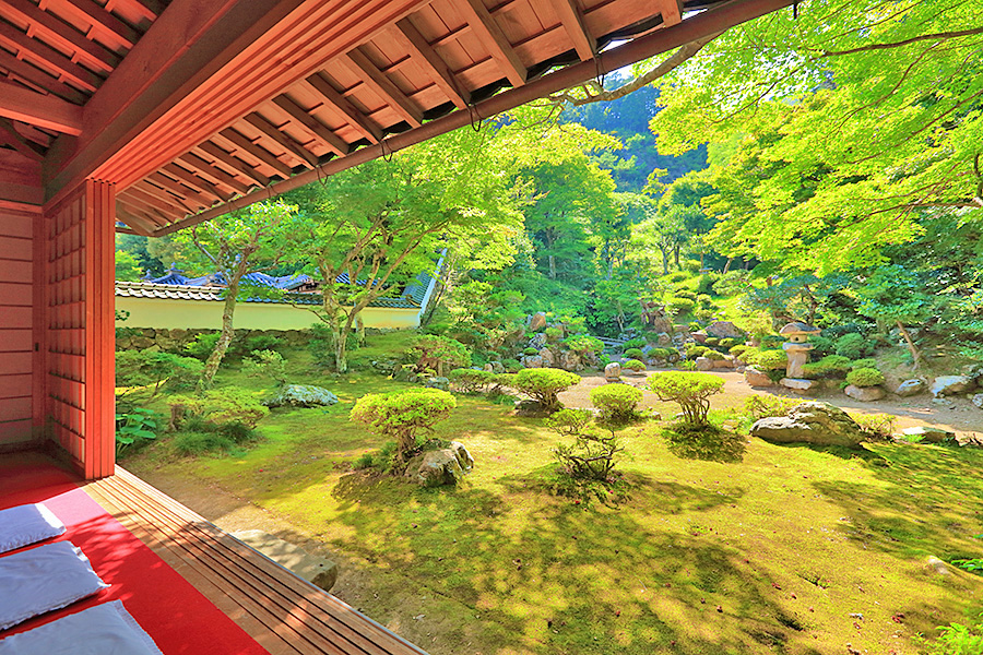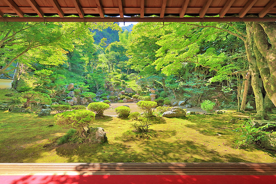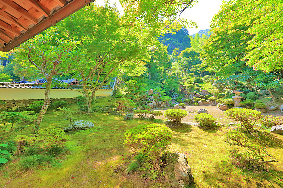 清瀧寺徳源院の見どころは、客殿の裏手にある池泉回遊式庭園「青龍の庭」。夏季には、青もみじが眩しい庭園風景が広がっている。紅葉時期は日々公開しているが、それ以外の時期は電話予約が必要となっている。滋賀県に指定されている名勝庭園。 |