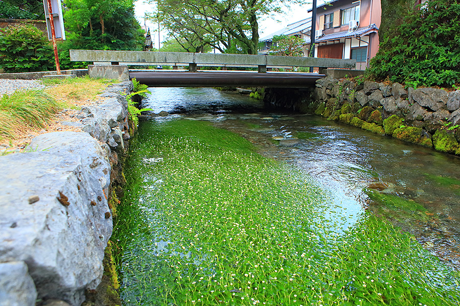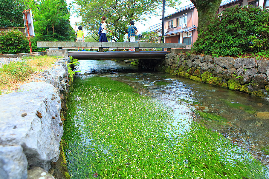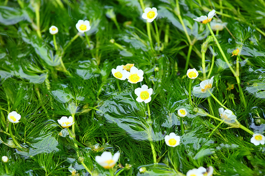 また米原市の醒ヶ井(さめがい)の水中に咲く梅花藻(ばいかも)も水中に咲く花として人気がある。中山道沿いの地蔵川のせせらぎの中で、かわいらしく咲いている。見頃は7〜8月下旬。 |