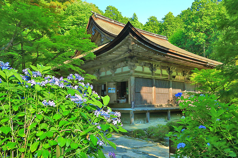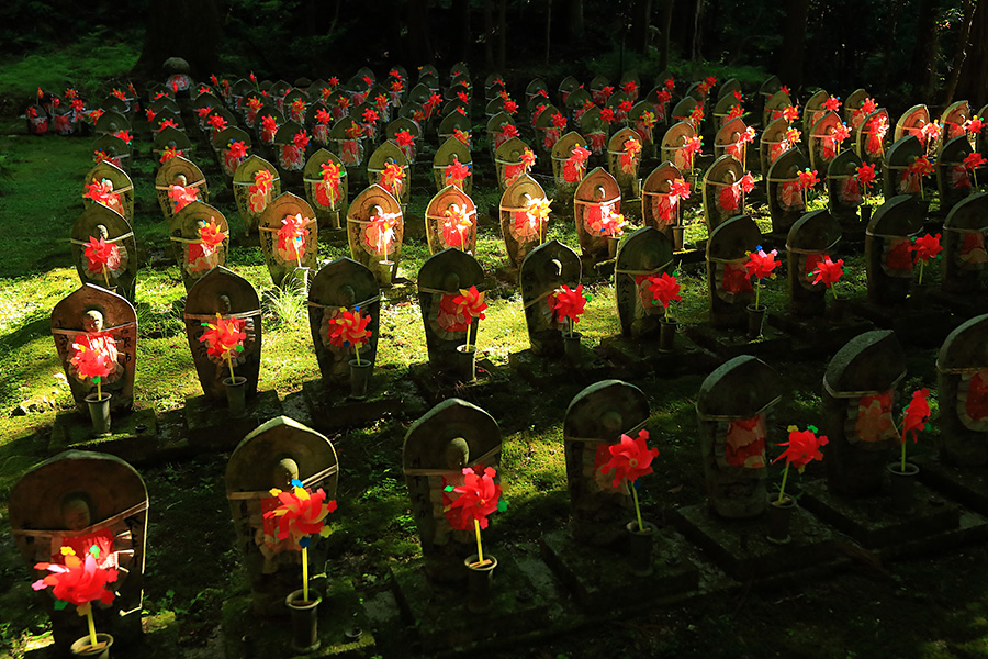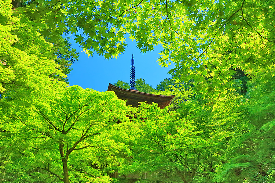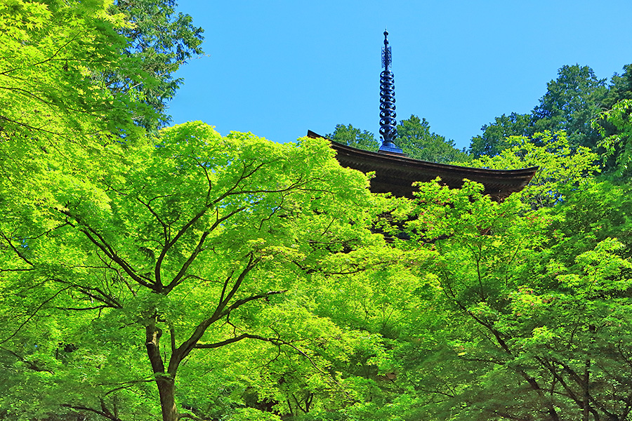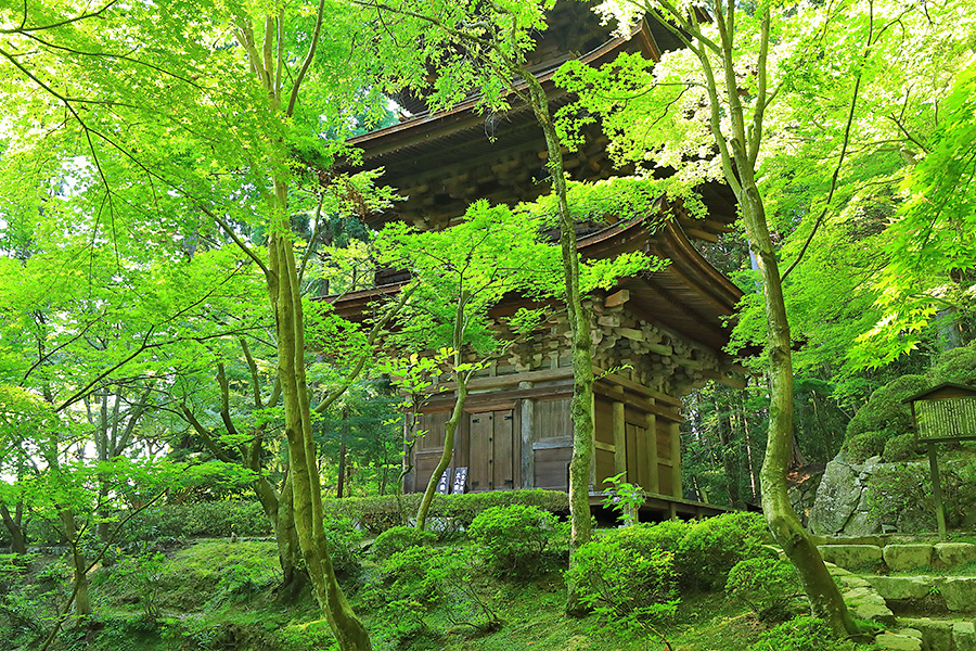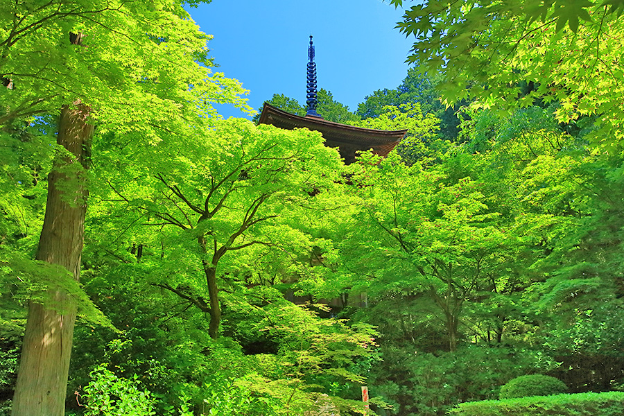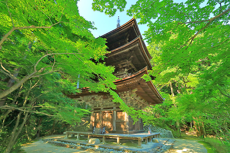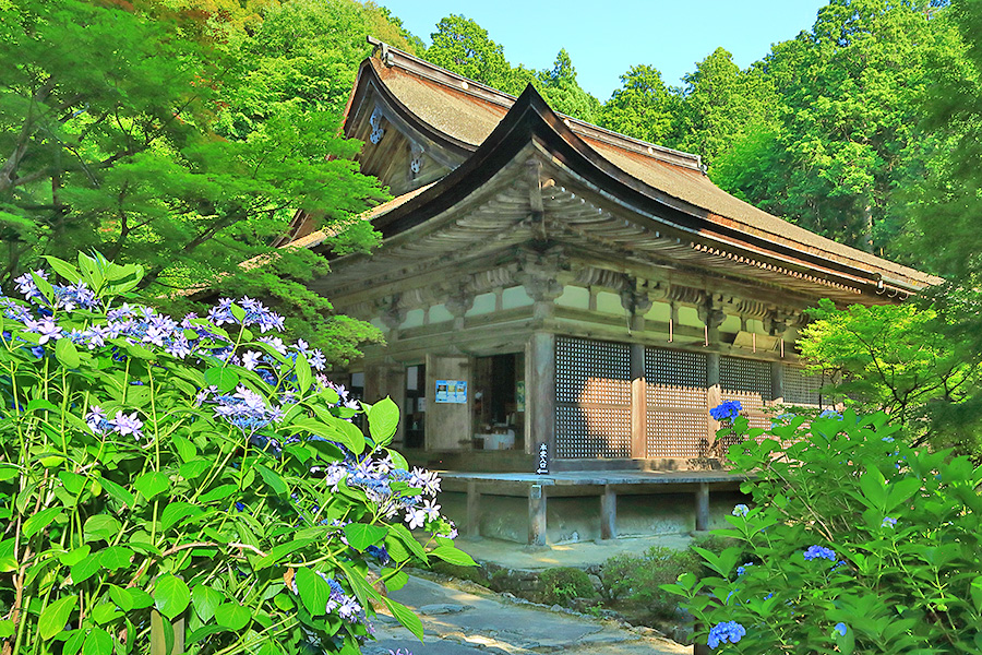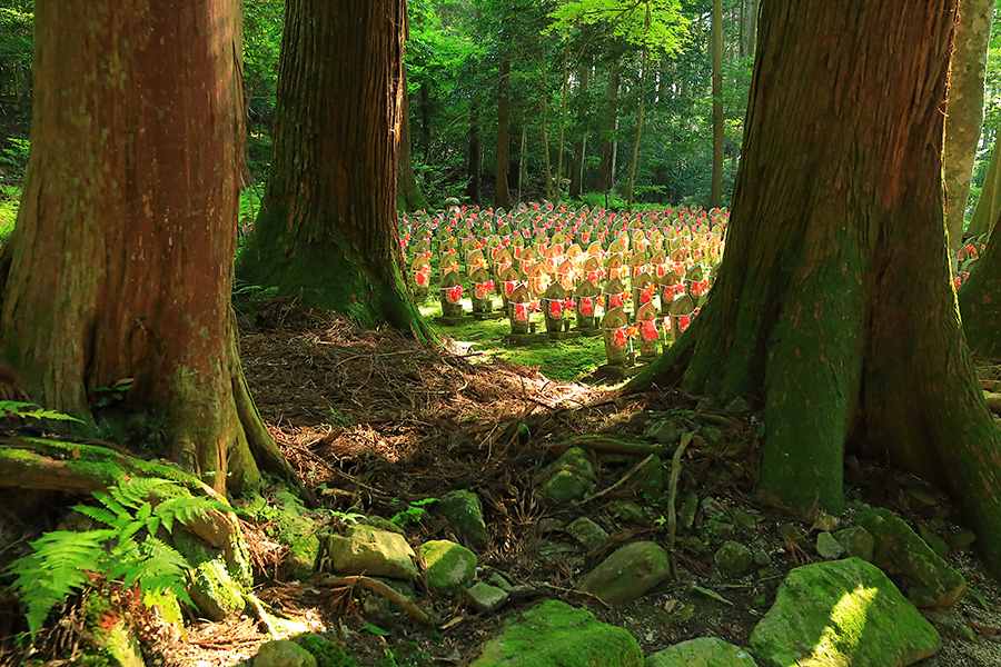 とにかく広々した境内を誇り、その全域が豊かな自然に恵まれており瑞々しい景観を見せてくれる。特に本堂のそばにある三重塔周辺に青もみじが多い。初夏には鮮やかな紫陽花が境内を彩る。本堂へと続く参道には、千体地蔵と呼ばれるたくさんのお地蔵さんが並んでいる。境内をゆっくり見て回ると1時間くらいはかかるだろう。 |