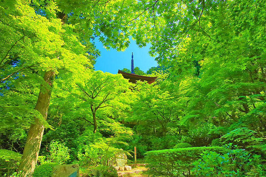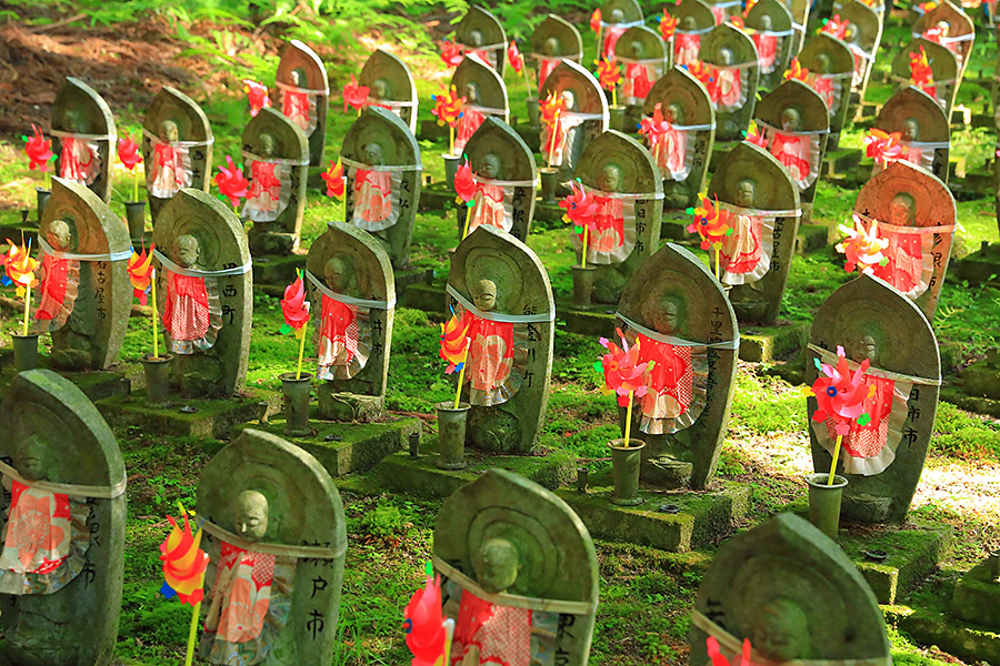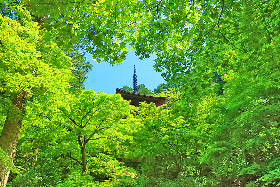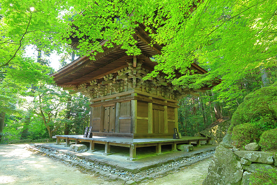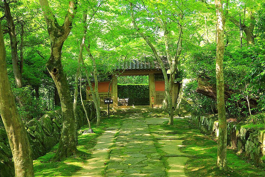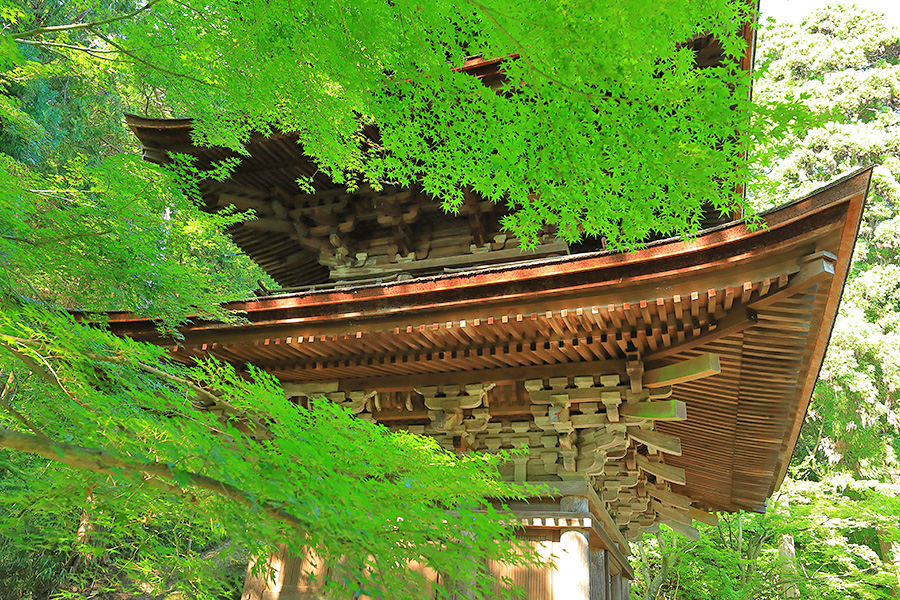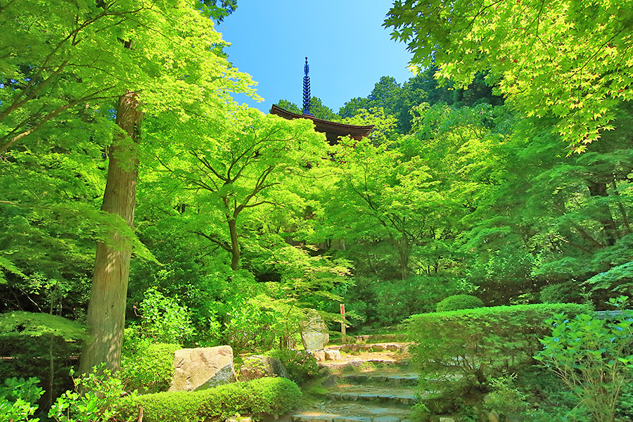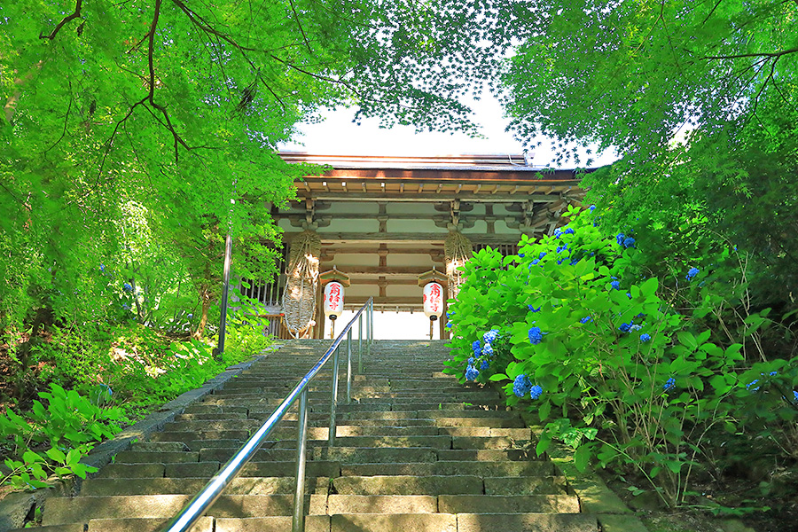 とにかく広々した境内を誇り、その全域が豊かな自然に恵まれており瑞々しい景観を見せてくれる。特に本堂のそばにある三重塔周辺に青もみじが多い。初夏には鮮やかな紫陽花が境内を彩る。本堂へと続く参道には、千体地蔵と呼ばれるたくさんのお地蔵さんが並んでいる。境内をゆっくり見て回ると1時間くらいはかかるだろう。 |