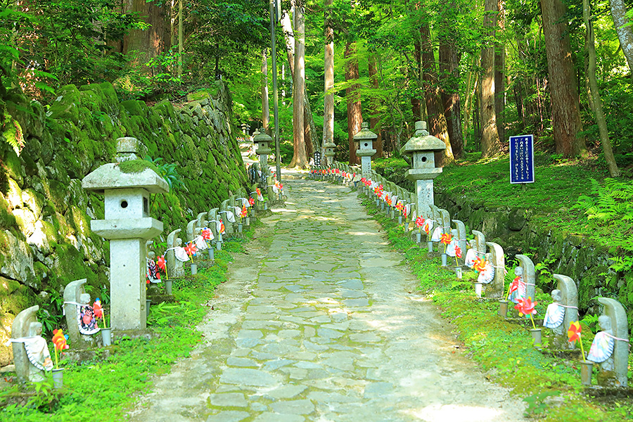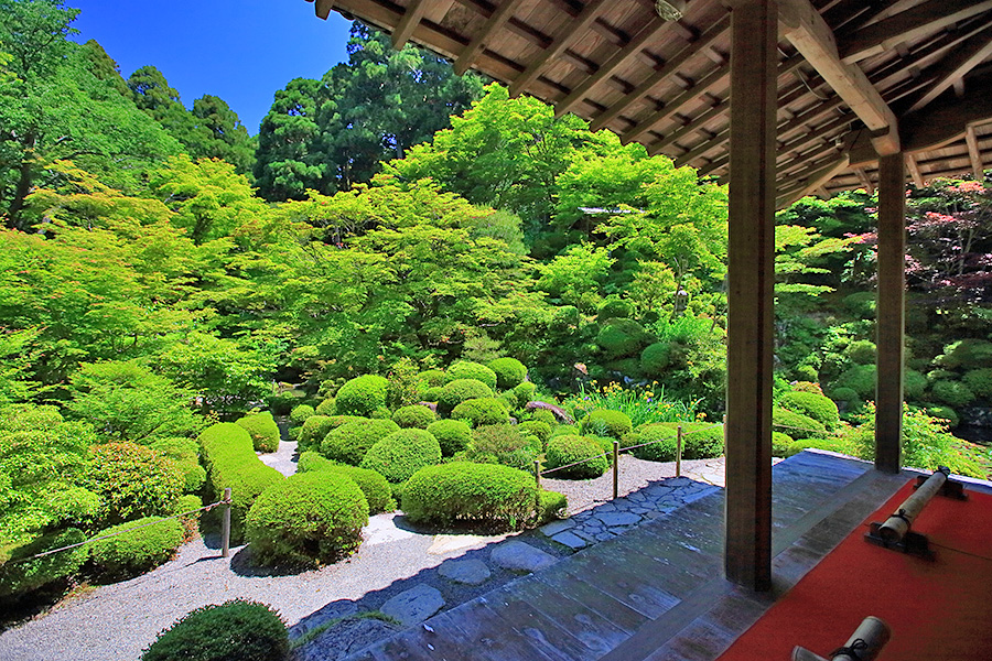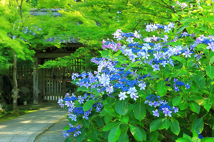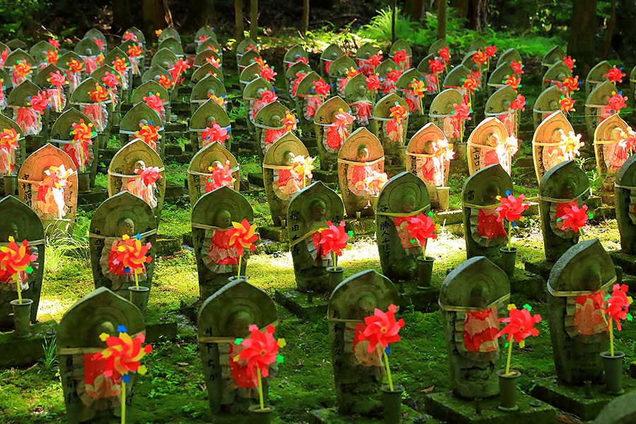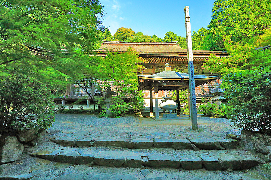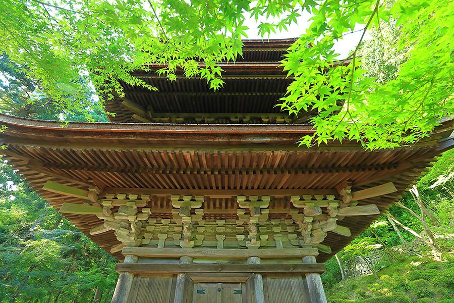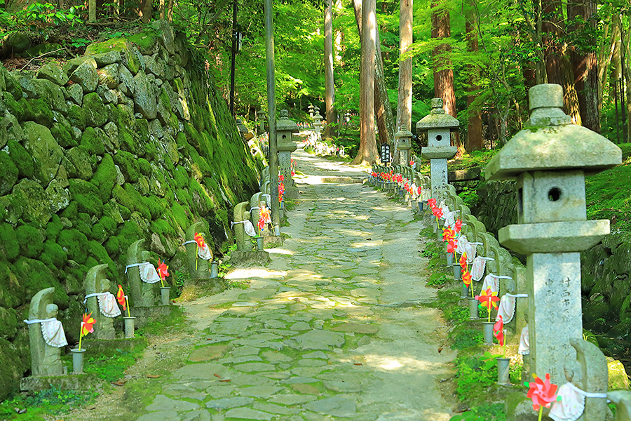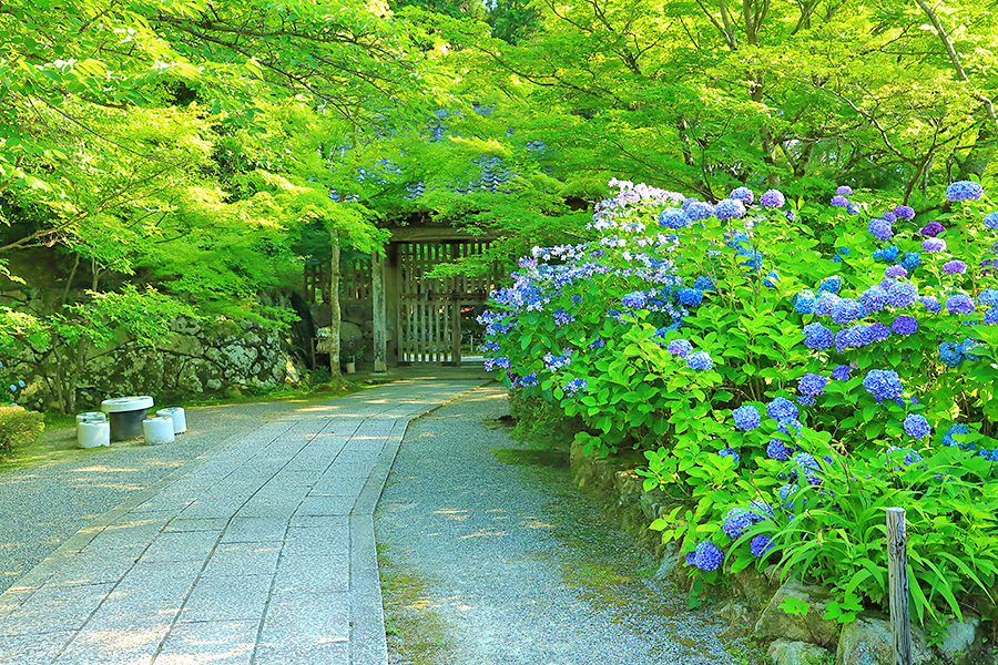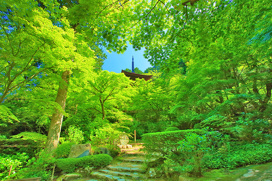とにかく広々した境内を誇り、その全域が豊かな自然に恵まれており瑞々しい景観を見せてくれる。特に本堂のそばにある三重塔周辺に青もみじが多い。初夏には鮮やかな紫陽花が境内を彩る。本堂へと続く参道には、千体地蔵と呼ばれるたくさんのお地蔵さんが並んでいる。境内をゆっくり見て回ると1時間くらいはかかるだろう。 |