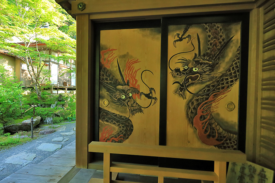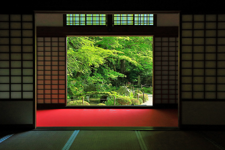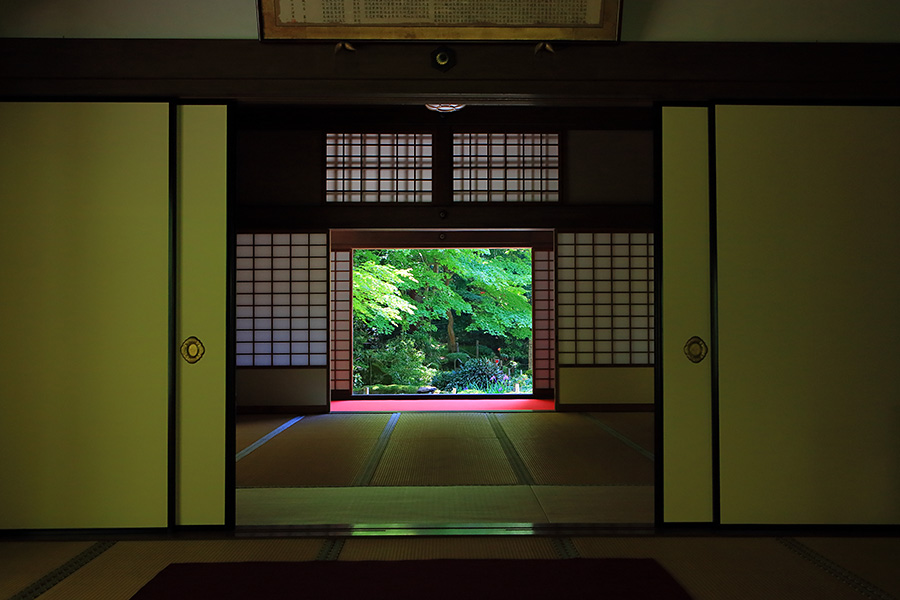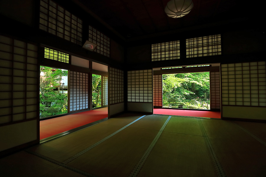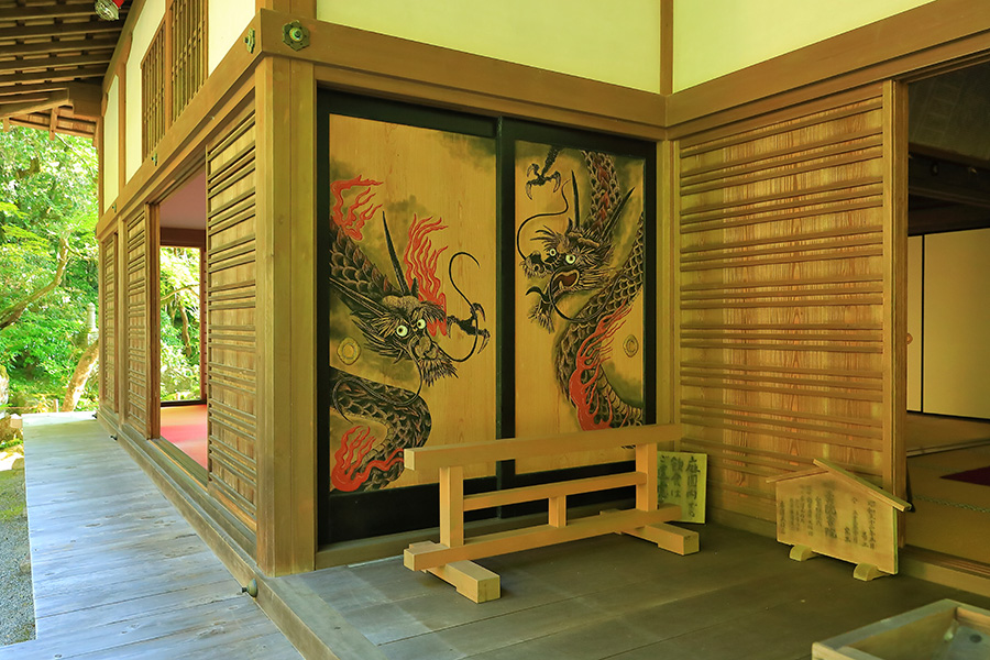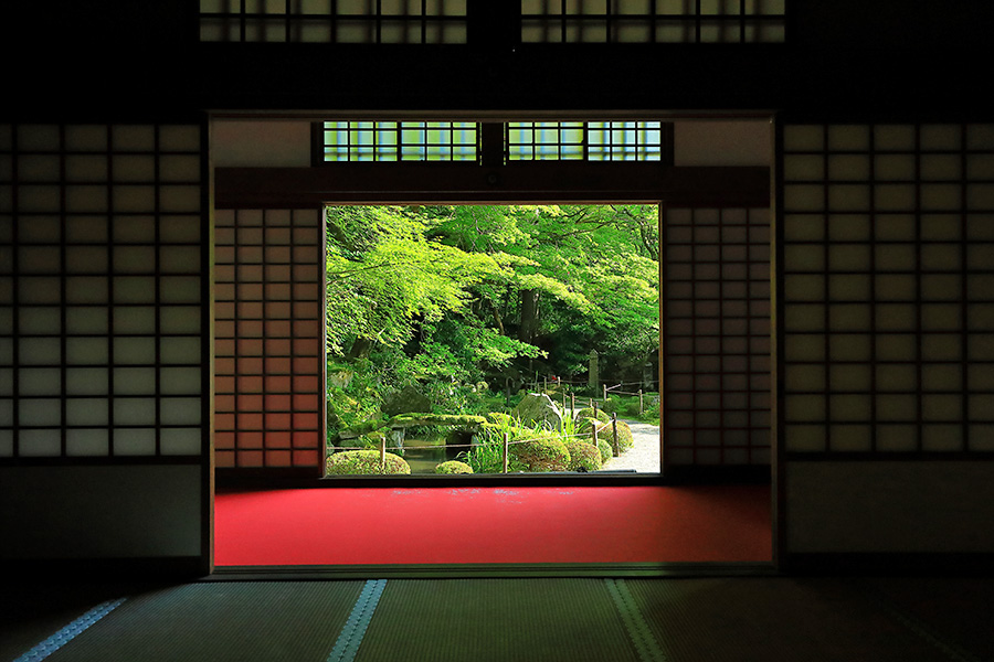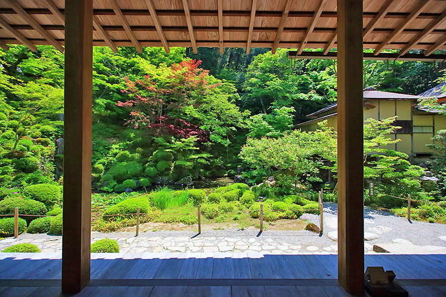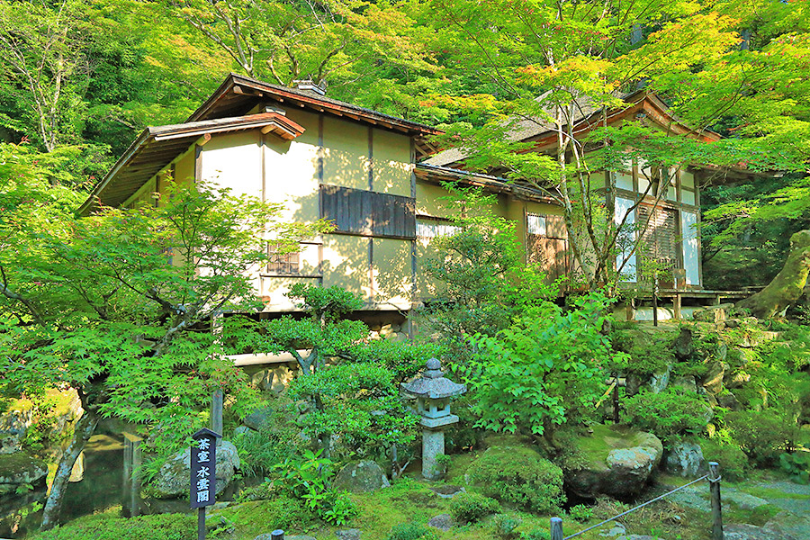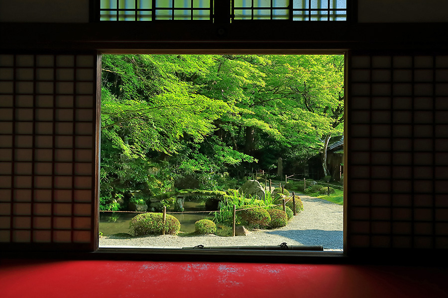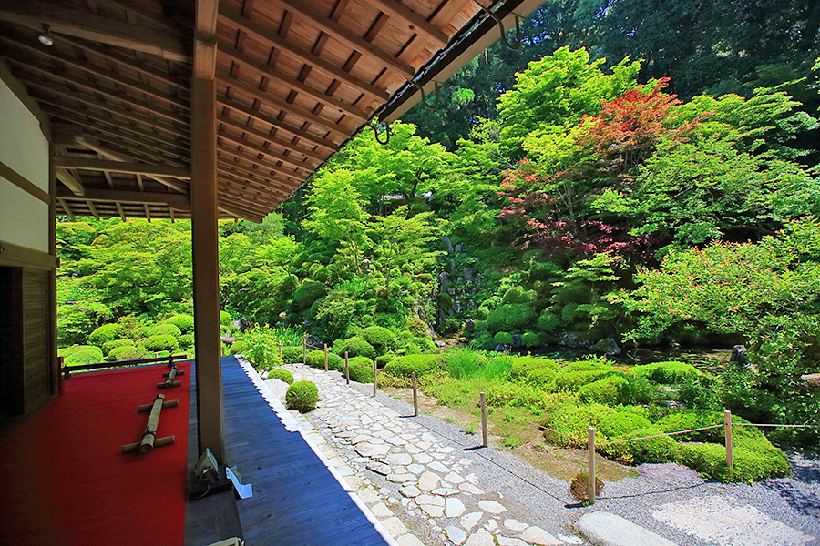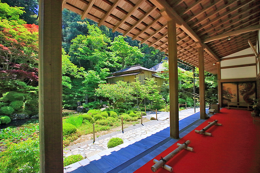 境内にある明寿院の名勝庭園は、池泉回遊式庭園となっていて庭園の奥まで散策できるようになっている。庭園内には水雲閣という茶室もある。明寿院の本坊内からお庭を見れば額縁に庭園が収まっているように見える。盛秋になると血染めのもみじと呼ばれる真っ赤なモミジが印象的な紅葉を見せてくれる。また冬季の雪景色も美しい景観。 |