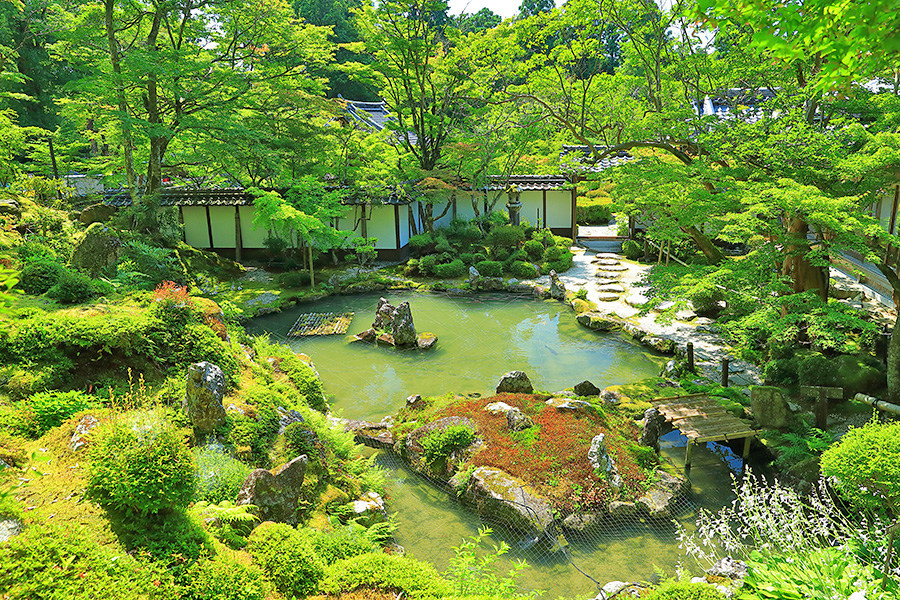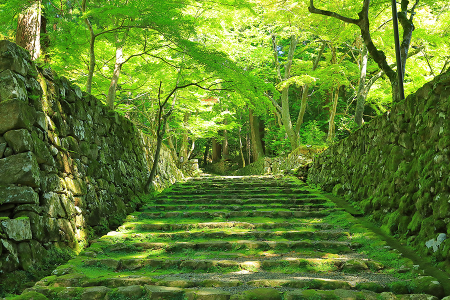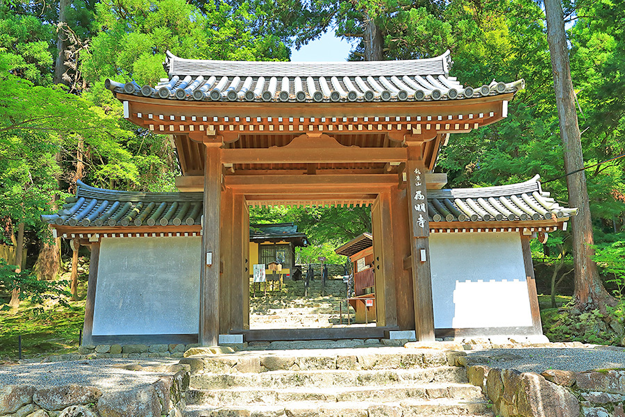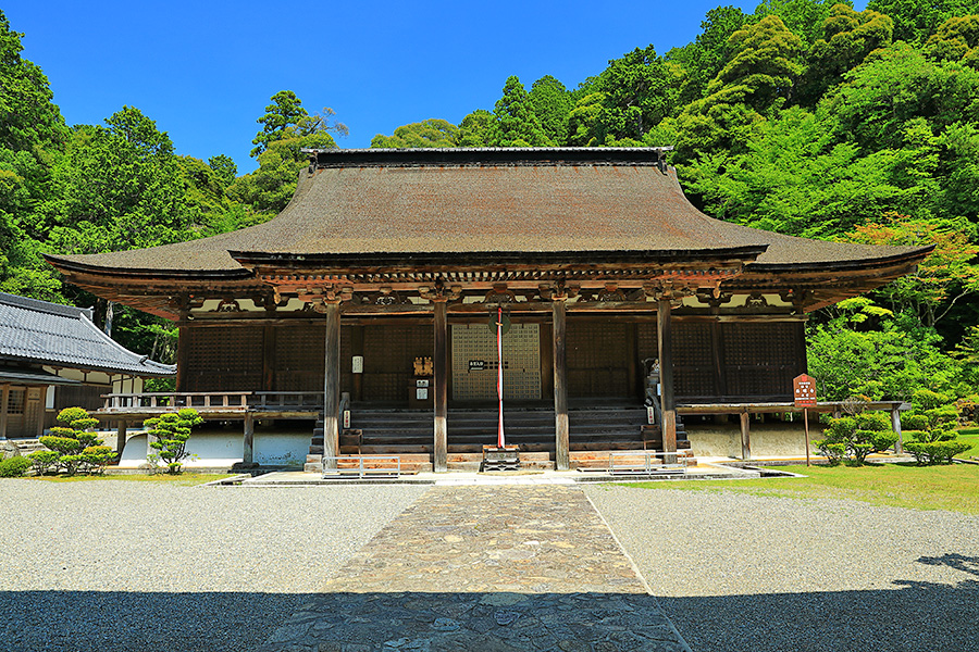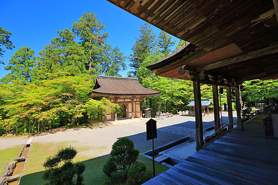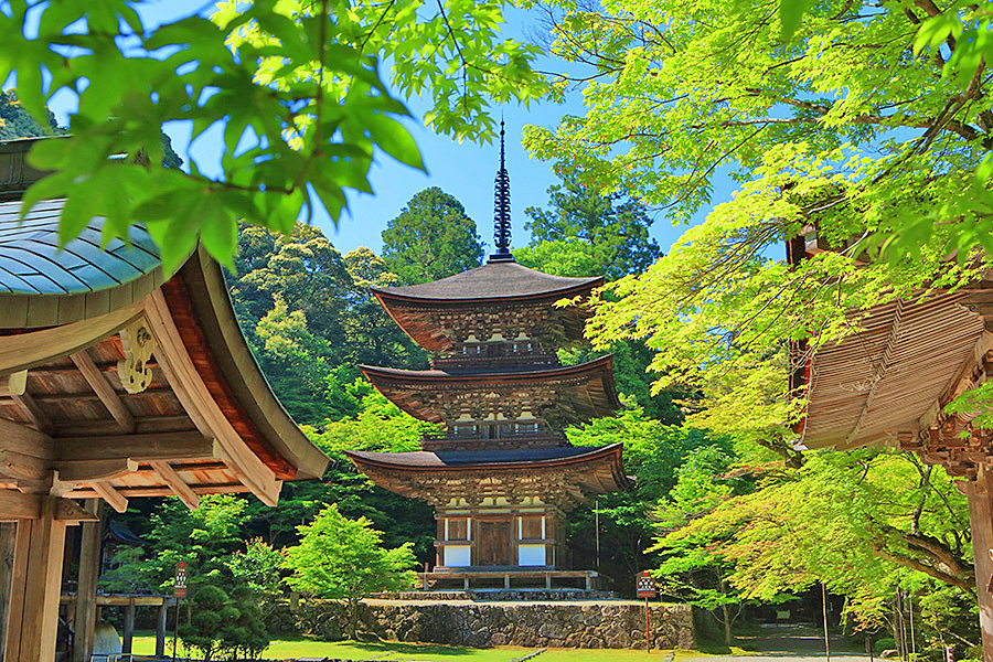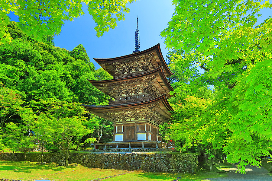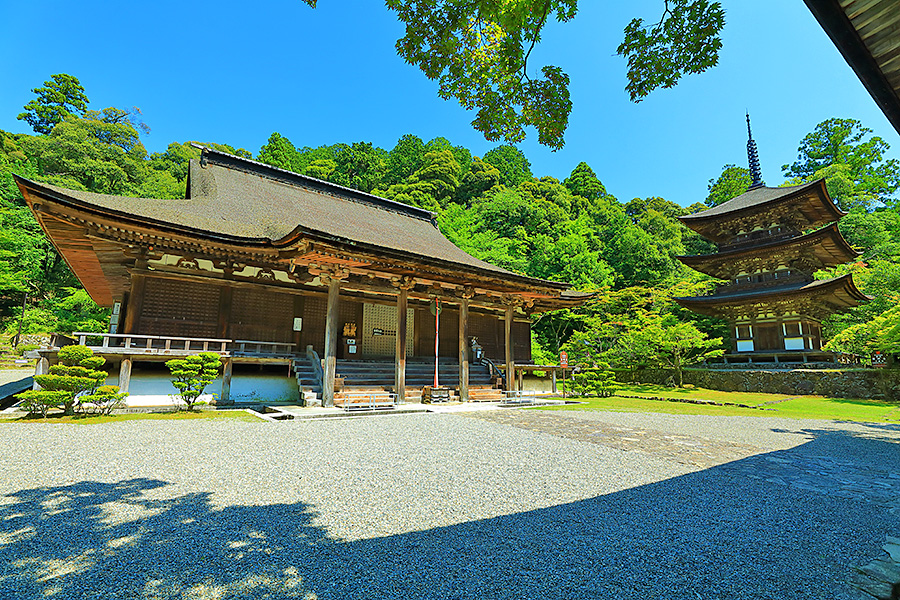 | 境内はとても広く、山門をくぐると本堂まで長い参道がつづく。その参道沿いにある豊かな自然が清々しい気分にさせてくれる。国宝である三重塔や二天門周辺に青もみじが多く、夏の観光客を魅了している。池泉回遊式の名勝庭園の蓬莱庭も見所のひとつ。二天門の近くには背の高い夫婦杉がある。 |