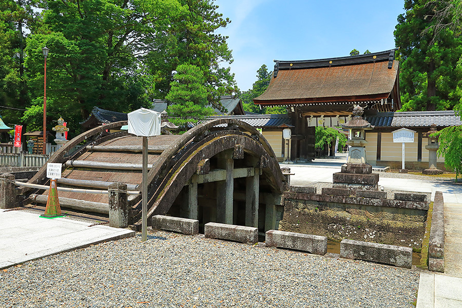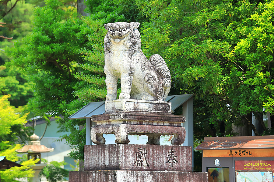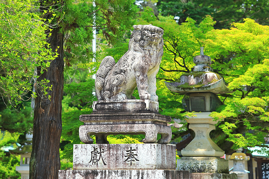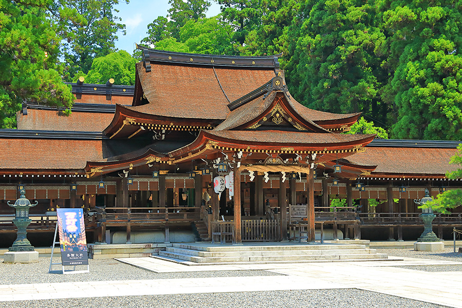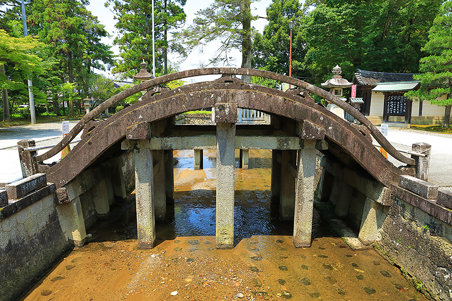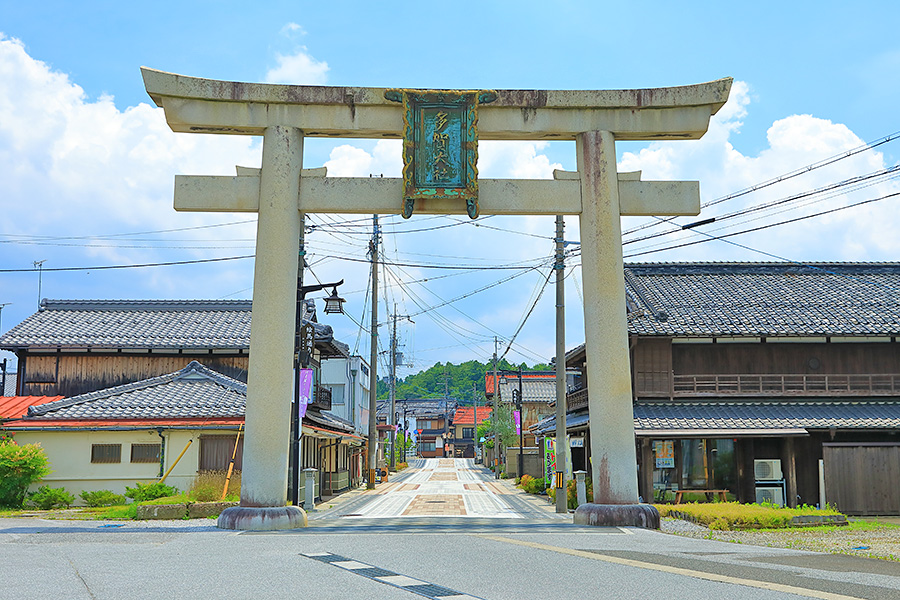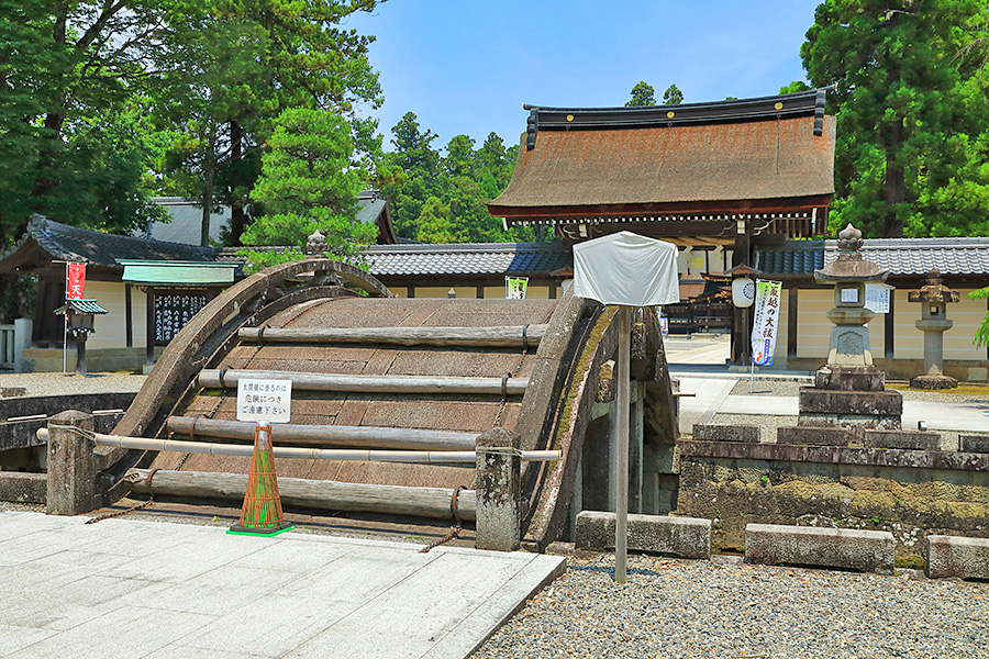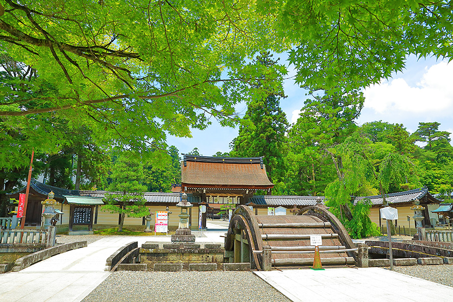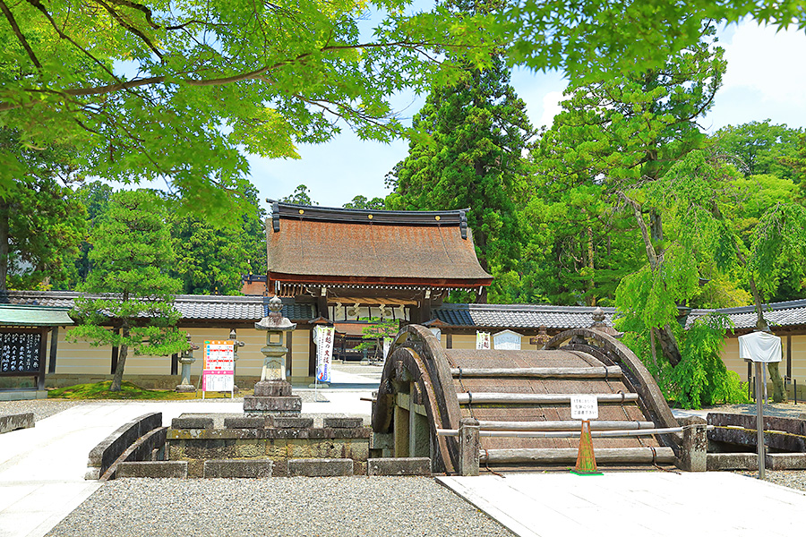 | 多賀大社・・・滋賀を代表する大きな神社である多賀大社(たがたいしゃ)。御祭神は伊邪那岐大神(いざなぎのおおかみ)、伊邪那美大神(いざなみのおおかみ)。延命長寿にご利益がある生命の神様を祀っている。地元の人からは「お多賀さん」と呼ばれ親しまれている。表門の前には豊臣秀吉から寄進された石のそり橋・太閤橋(たいこうばし)があり、その太閤橋の近くには青もみじが見られる。そして一の鳥居から二の鳥居までの表参道絵馬通りには休憩処やお食事処が並んでいる。 |