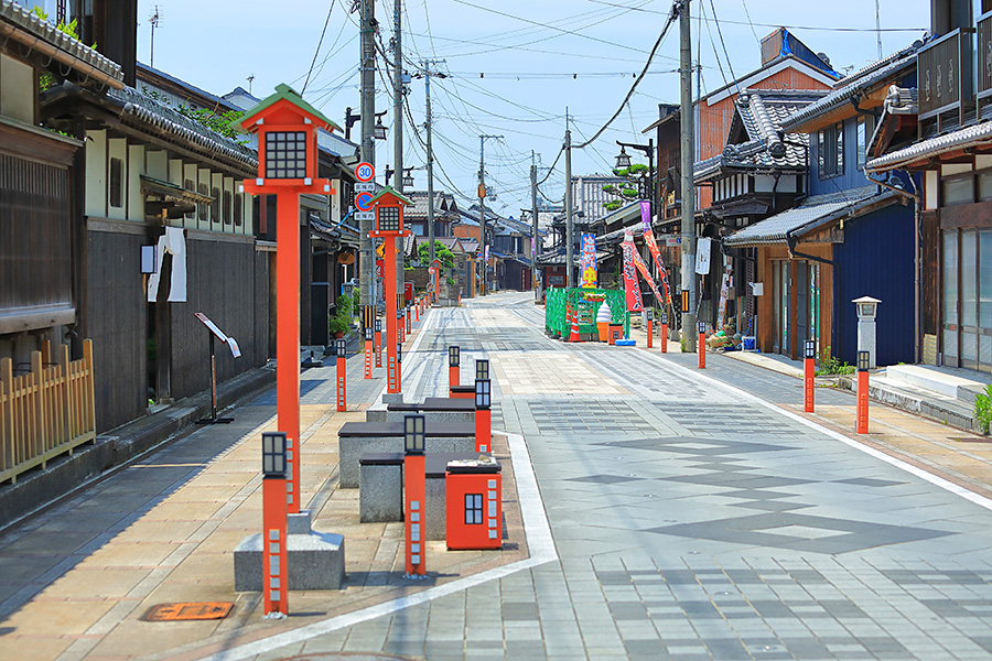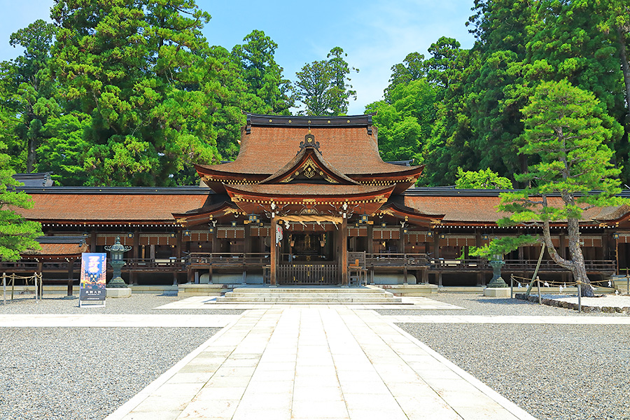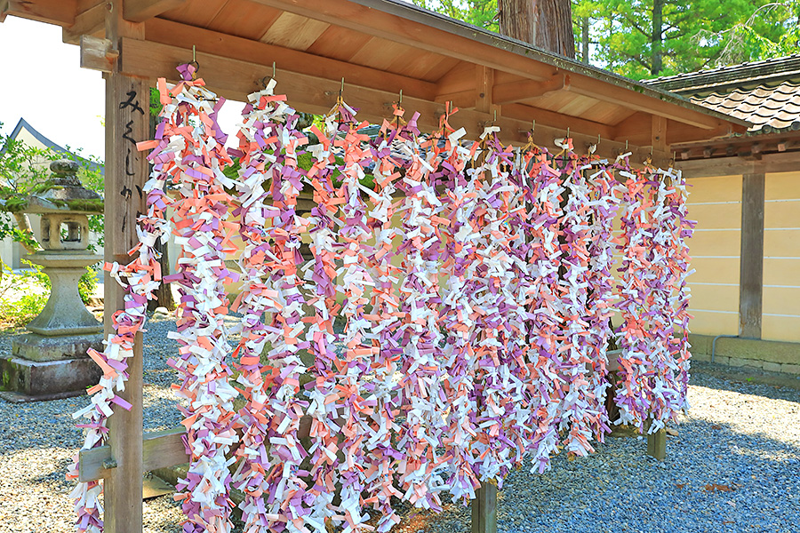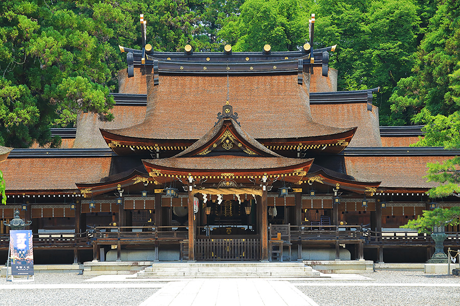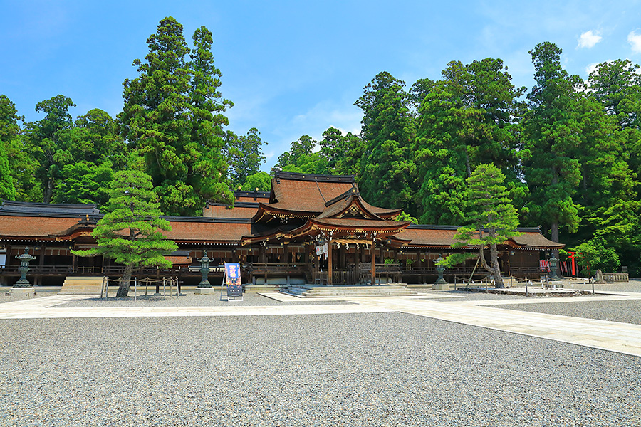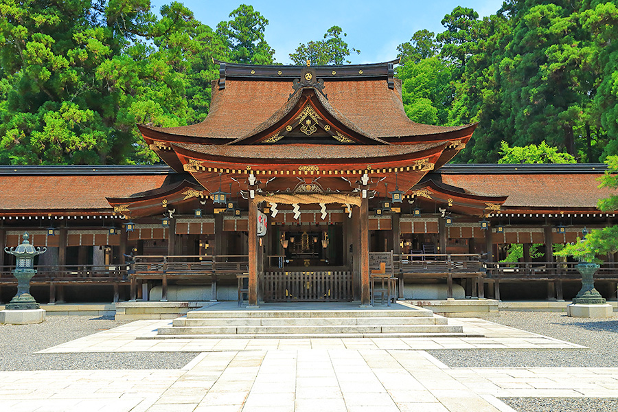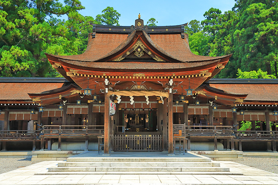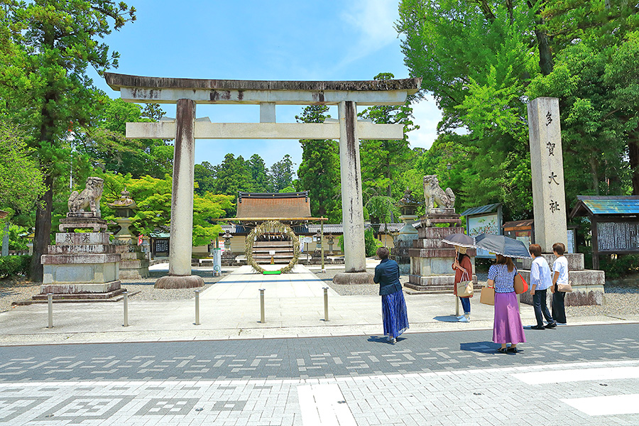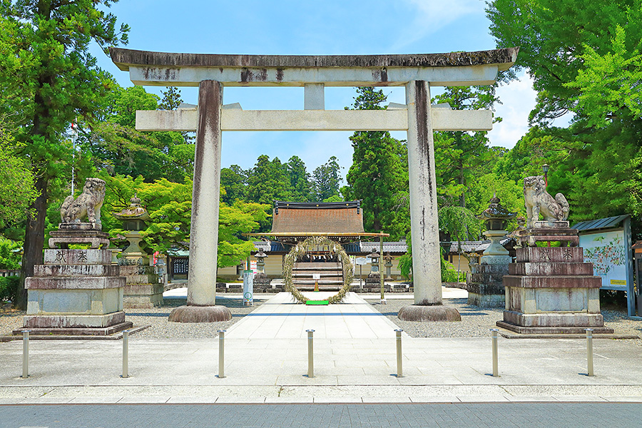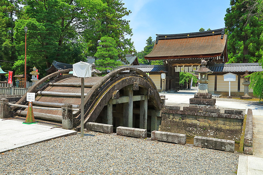 | 多賀大社・・・滋賀を代表する大きな神社である多賀大社(たがたいしゃ)。御祭神は伊邪那岐大神(いざなぎのおおかみ)、伊邪那美大神(いざなみのおおかみ)。延命長寿にご利益がある生命の神様を祀っている。地元の人からは「お多賀さん」と呼ばれ親しまれている。表門の前には豊臣秀吉から寄進された石のそり橋・太閤橋(たいこうばし)があり、その太閤橋の近くには青もみじが見られる。そして一の鳥居から二の鳥居までの表参道絵馬通りには休憩処やお食事処が並んでいる。 |