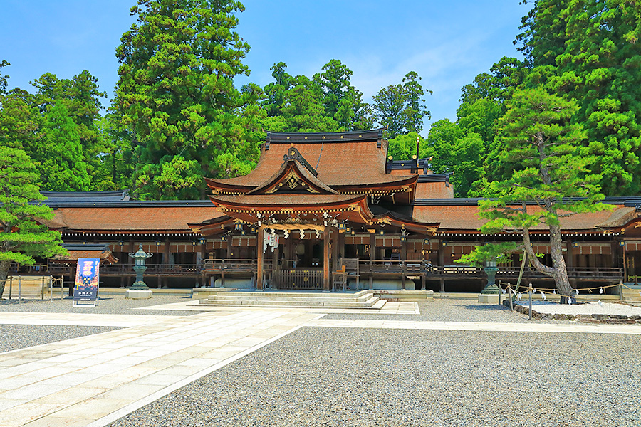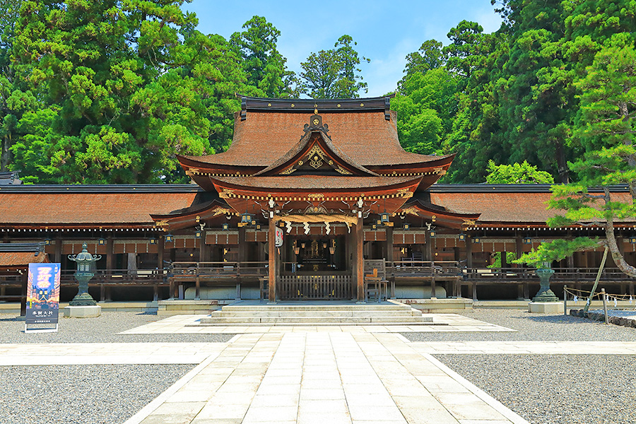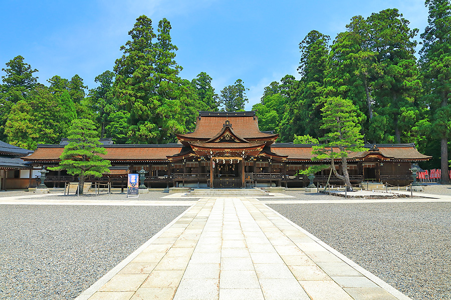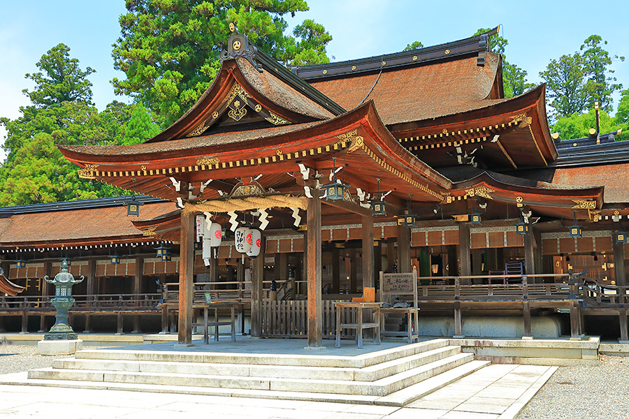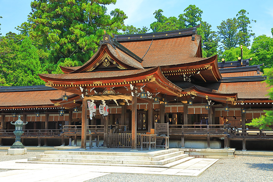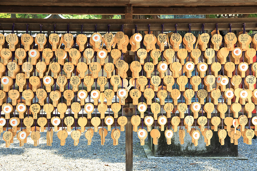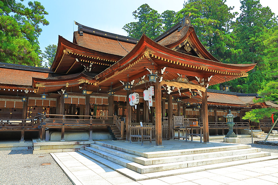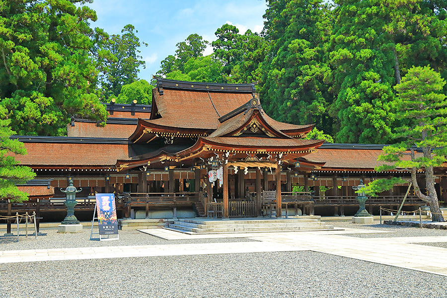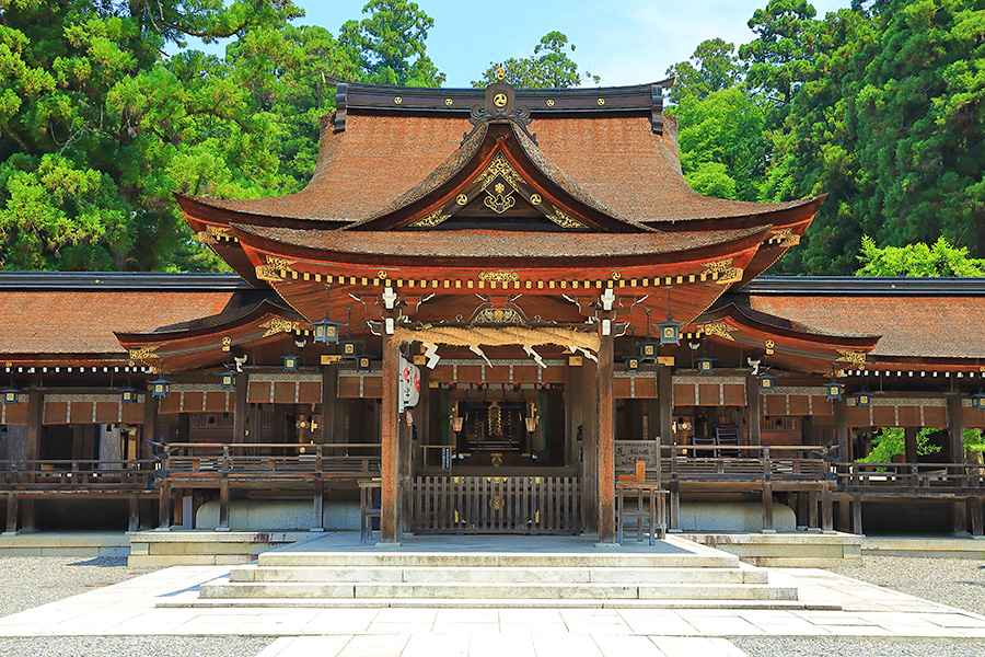 | 多賀大社・・・滋賀を代表する大きな神社である多賀大社(たがたいしゃ)。御祭神は伊邪那岐大神(いざなぎのおおかみ)、伊邪那美大神(いざなみのおおかみ)。延命長寿にご利益がある生命の神様を祀っている。地元の人からは「お多賀さん」と呼ばれ親しまれている。表門の前には豊臣秀吉から寄進された石のそり橋・太閤橋(たいこうばし)があり、その太閤橋の近くには青もみじが見られる。そして一の鳥居から二の鳥居までの表参道絵馬通りには休憩処やお食事処が並んでいる。 |