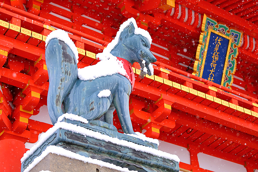 千本鳥居はトンネルになっているので鳥居の内側に雪は積もりにくい。それを雪景色として撮影するにはポジショニングに気を付けなければならない。また伏見稲荷大社では神の使いはきつねとなっており、狐像が境内にたくさんある。 |