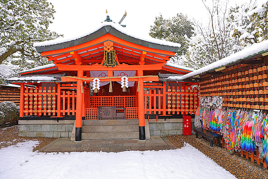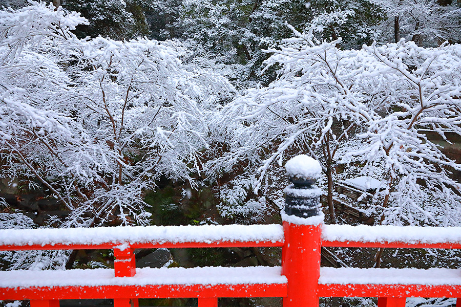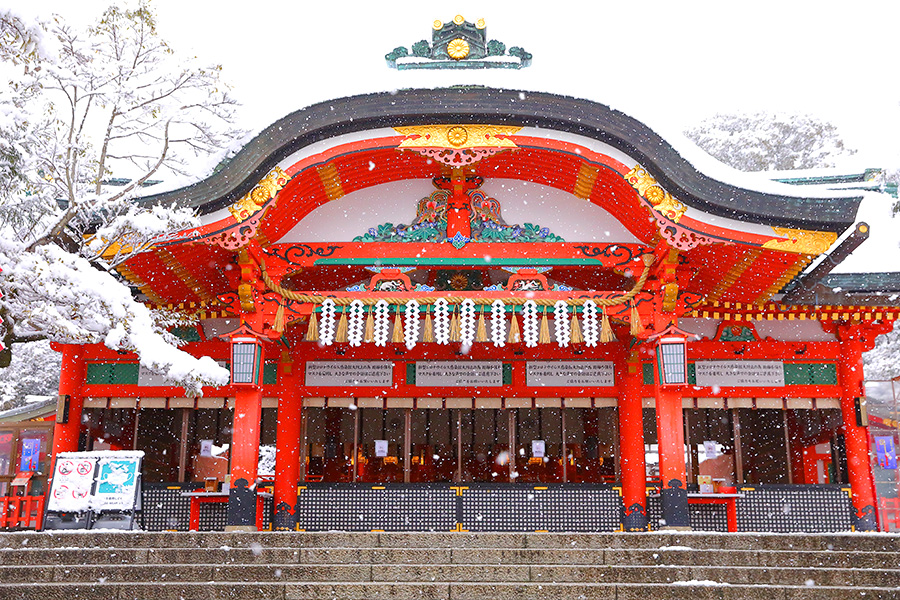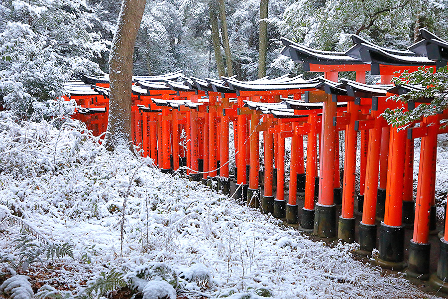 伏見稲荷大社の本殿や楼門あたりは朱塗りの建造物が多く並んでおり、真っ白な雪景色の中によく映える。伏見稲荷大社の境内は稲荷山全体に広がっており、様々な雪景色が見られる。 |