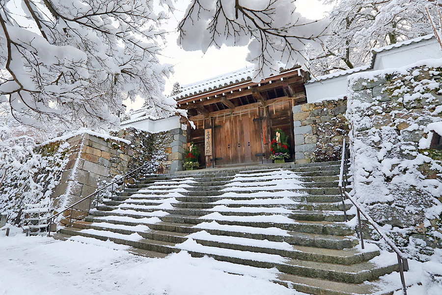 京都市の大原エリアに位置する三千院(さんぜんいん)。雄大な自然に恵まれたスケールの大きな雪景色が楽しめる場所として知られている。広々とした境内に雪が積った日には感動を誘う景観が迎えてくれる。 |