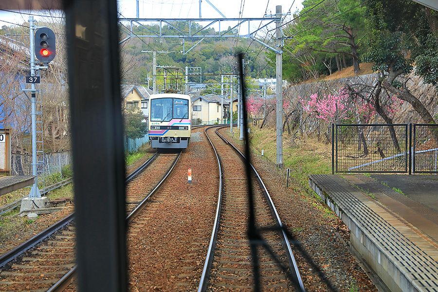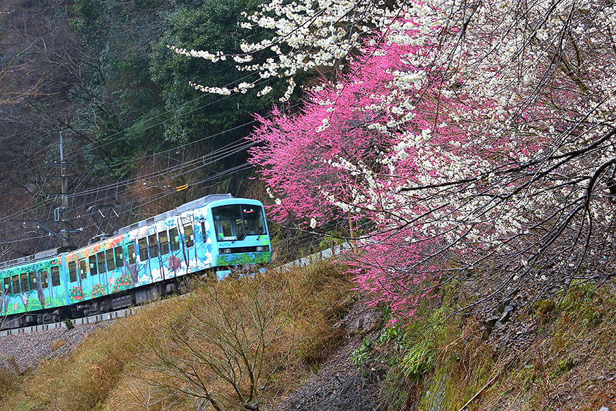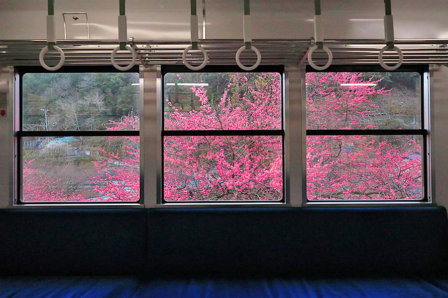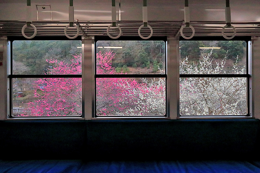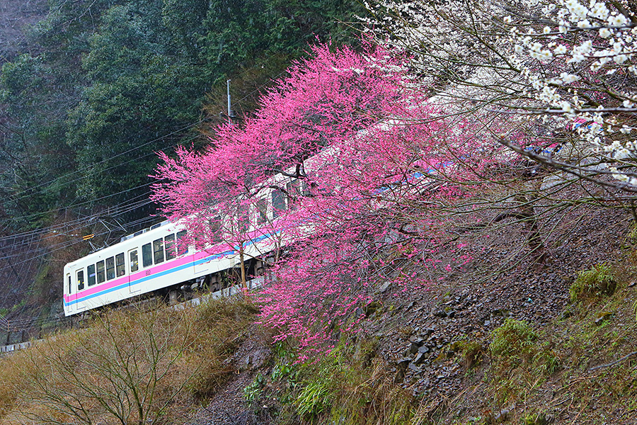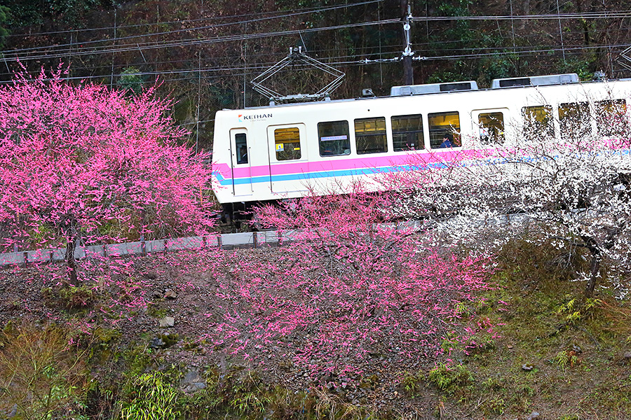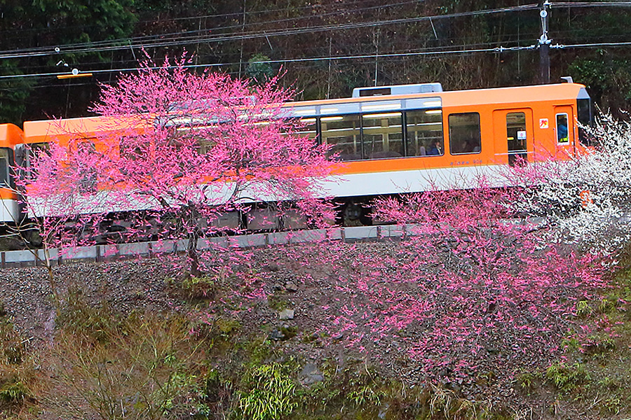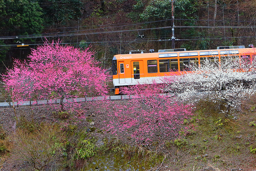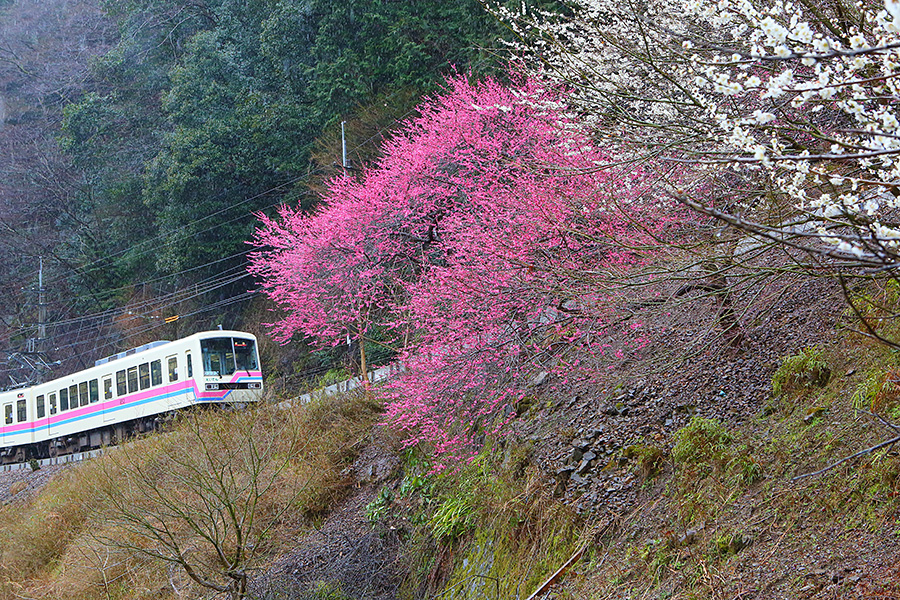 京都市の洛北エリアを走る叡山電車(えいざんでんしゃ)。そこに早春時期が訪れると、その沿線沿いに梅の花を見ることができる。梅木は鞍馬エリアに近い場所の多くあり、車窓から眺めることもできる。 |