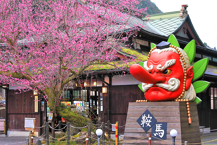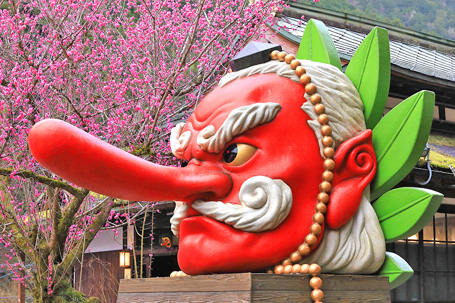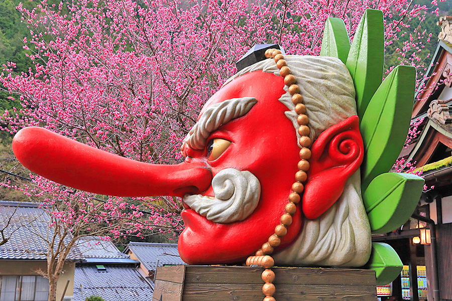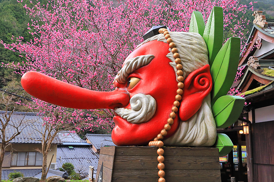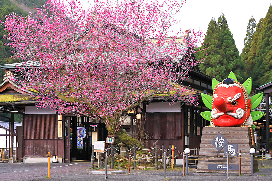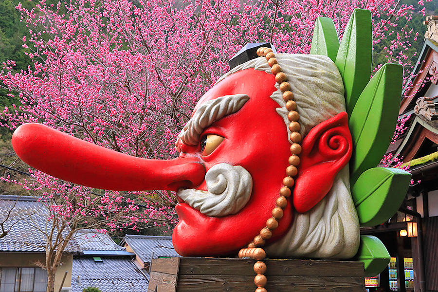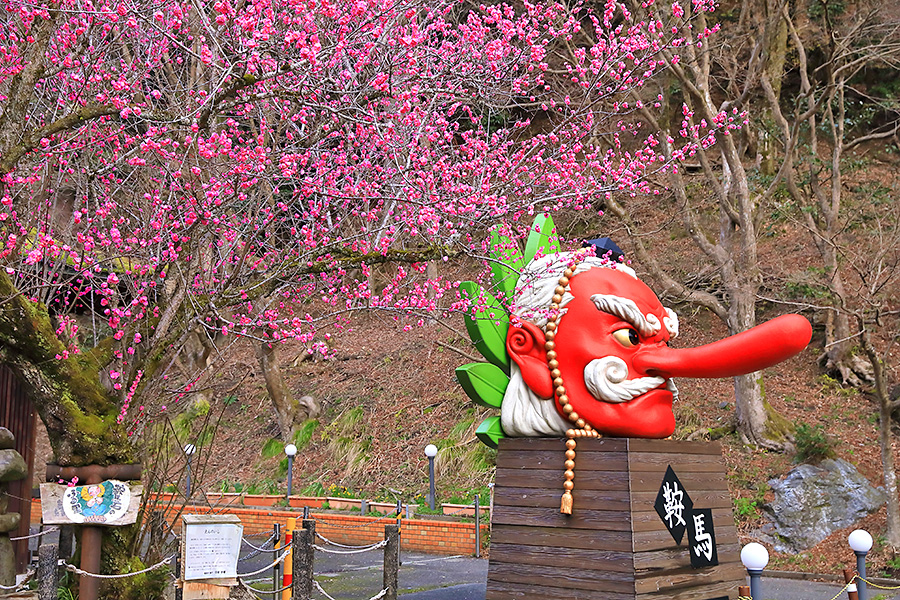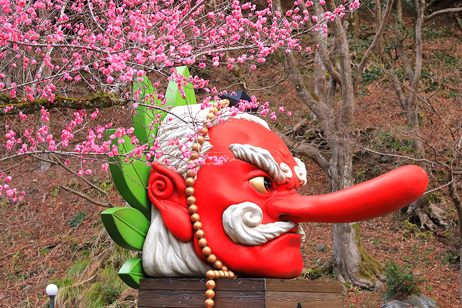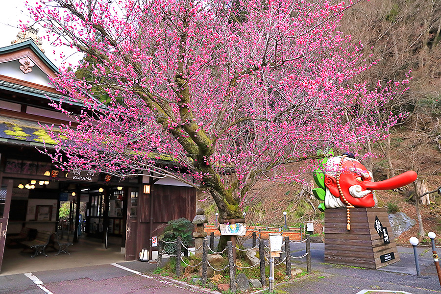 この梅の木のそばには、鞍馬のシンボル的な存在である鞍馬大天狗モニュメントがあるので、コラボ写真が撮れる。大天狗の朱色と梅の鮮やかなピンク色が春らしい華やかな絵になるフォトジェニックな梅スポット。 |