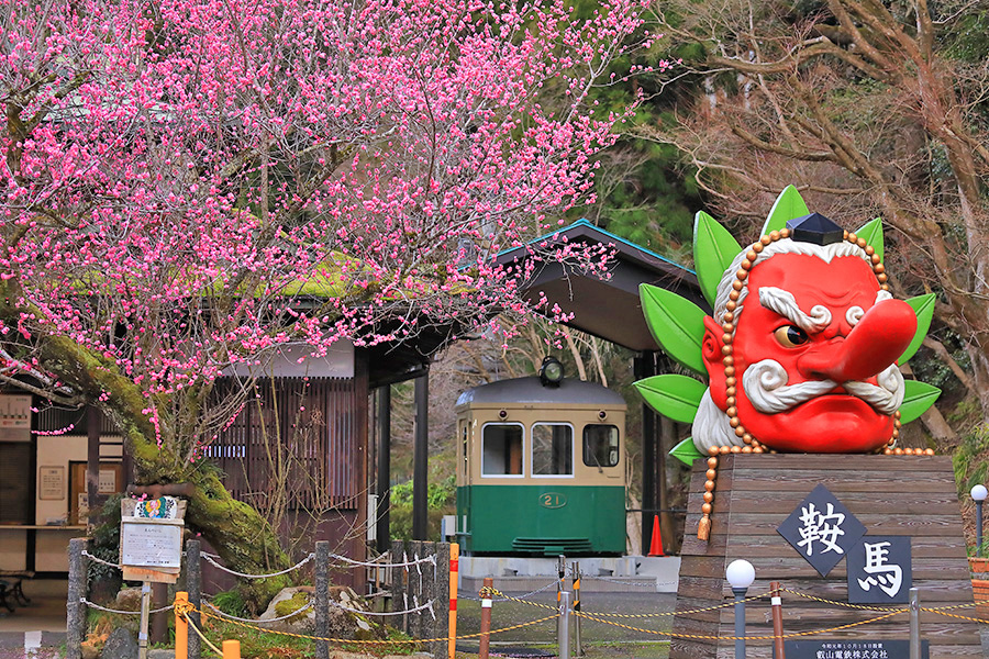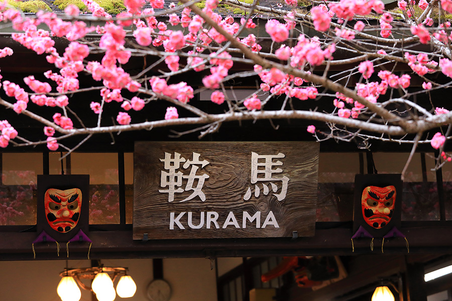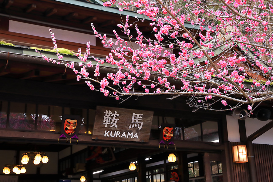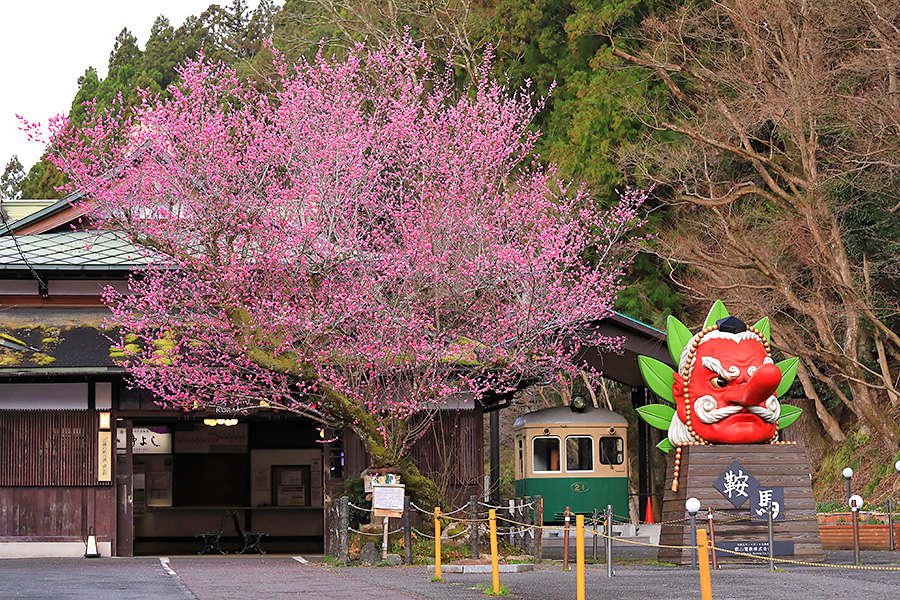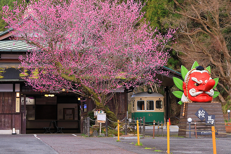京都市山間部に位置する叡山電車の鞍馬駅(くらまえき)。 洛北エリアを走る叡山電車の終着駅となっている。その鞍馬駅を出てすぐのところに梅の木がある。とても大きな梅の木で、鮮やかな花を咲かせる。冬の寒さが厳しい鞍馬だが、この梅の花が咲けば春の訪れが感じられる。 |