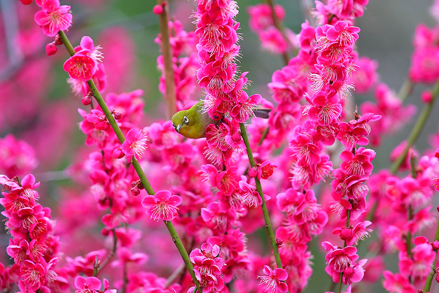 優雅に咲く光琳の梅にはメジロも蜜を求めて訪れている。 |